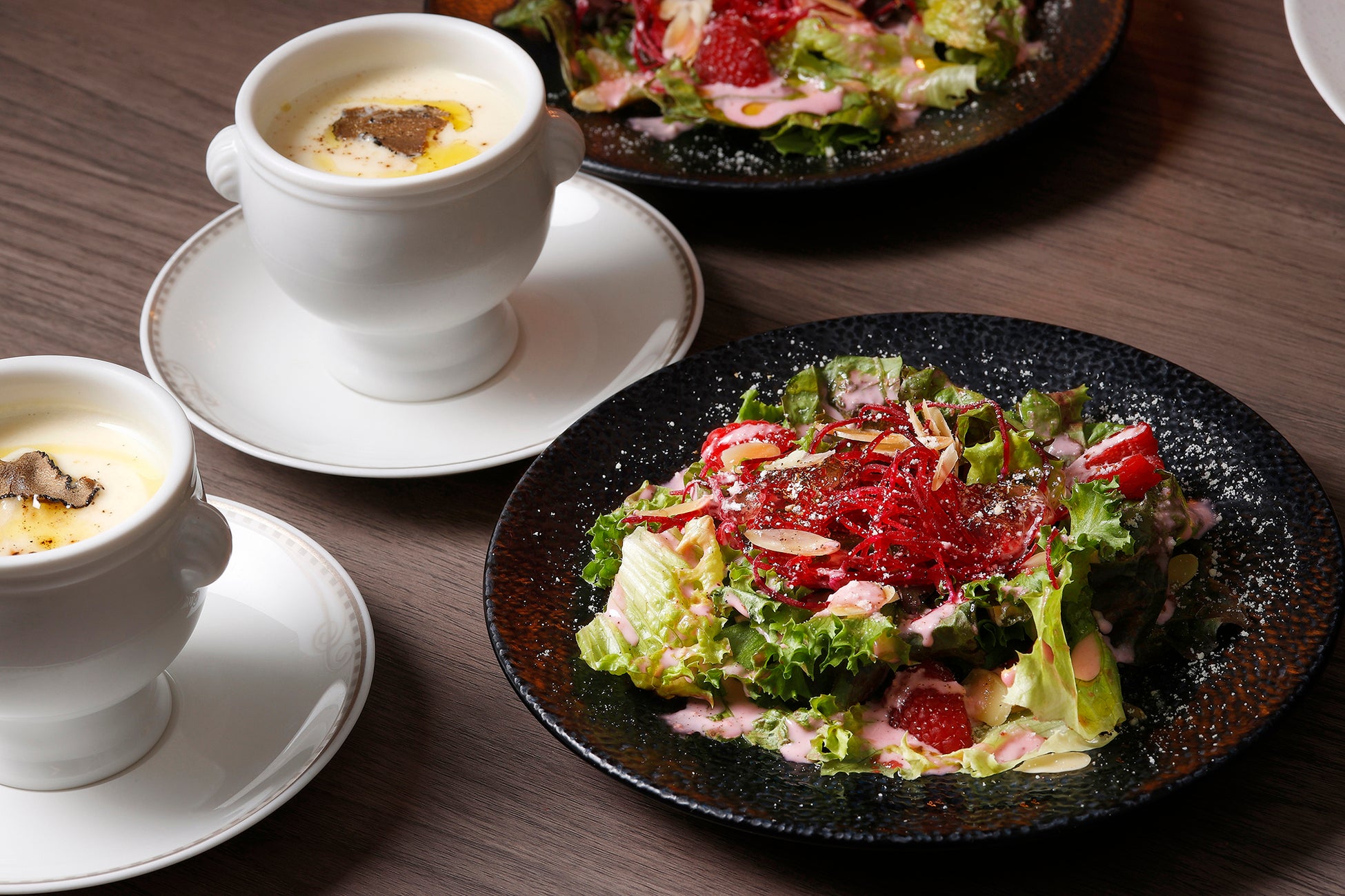 セイボリーは、キャビアを添えたホワイトチョコレートとカリフラワーのムースや、オマール海老のクリームソースをかけたアランチーニなど、クリスマスらしい高級食材をあしらった4種類がラインアップ。さらに、ラズベリーとビーツがルビーをイメージさせるサラダや、トリュフ香る温かいポタージュも付いた、贅沢かつボリューム満点の内容でお届けいたします。
