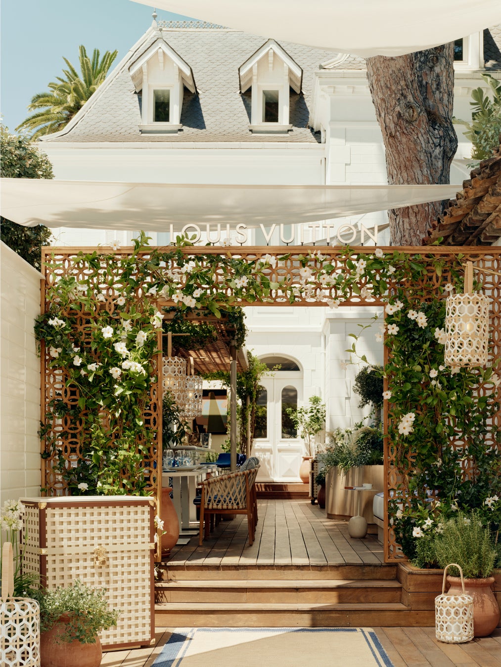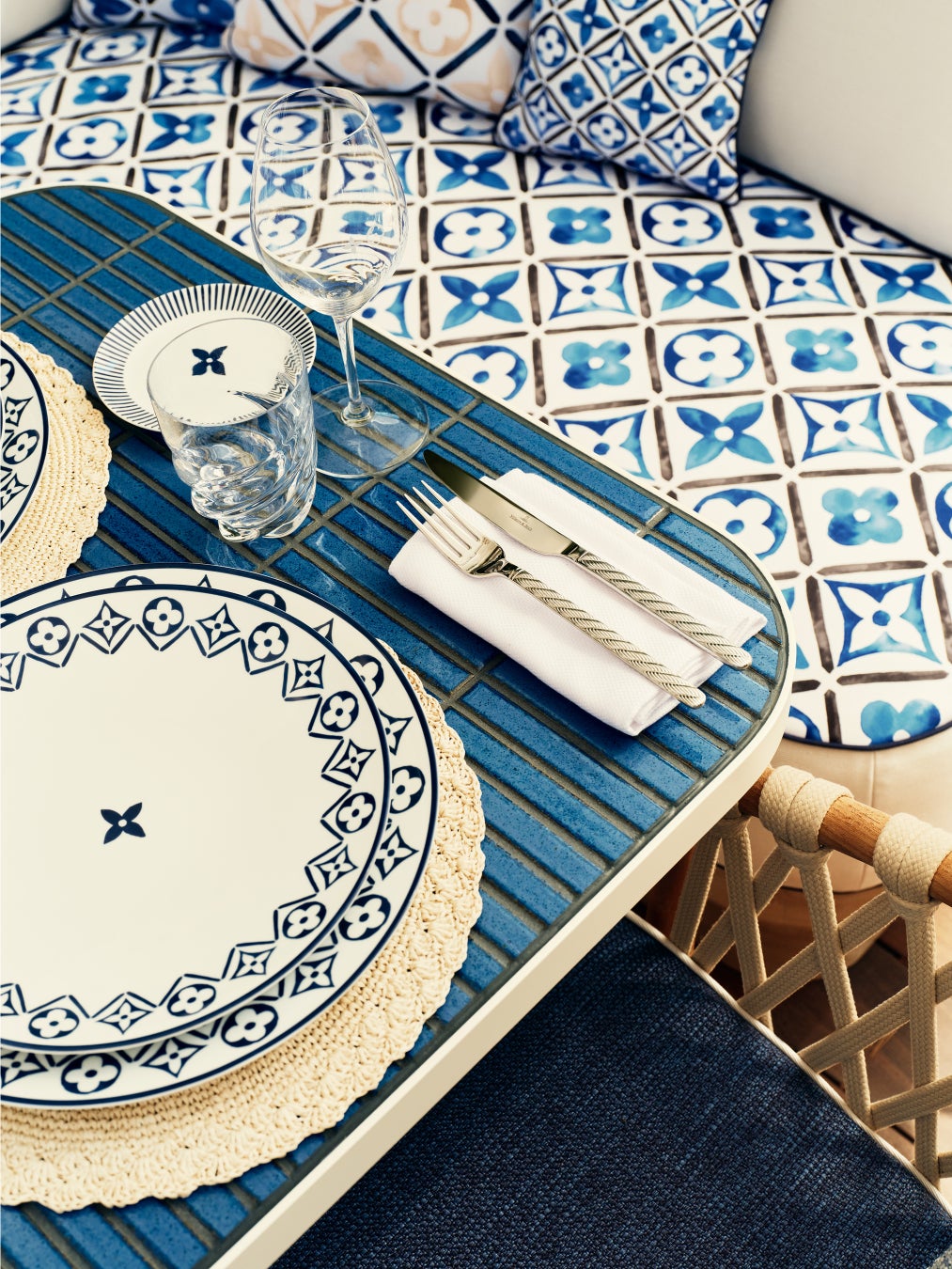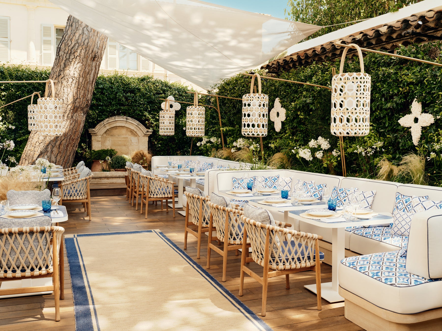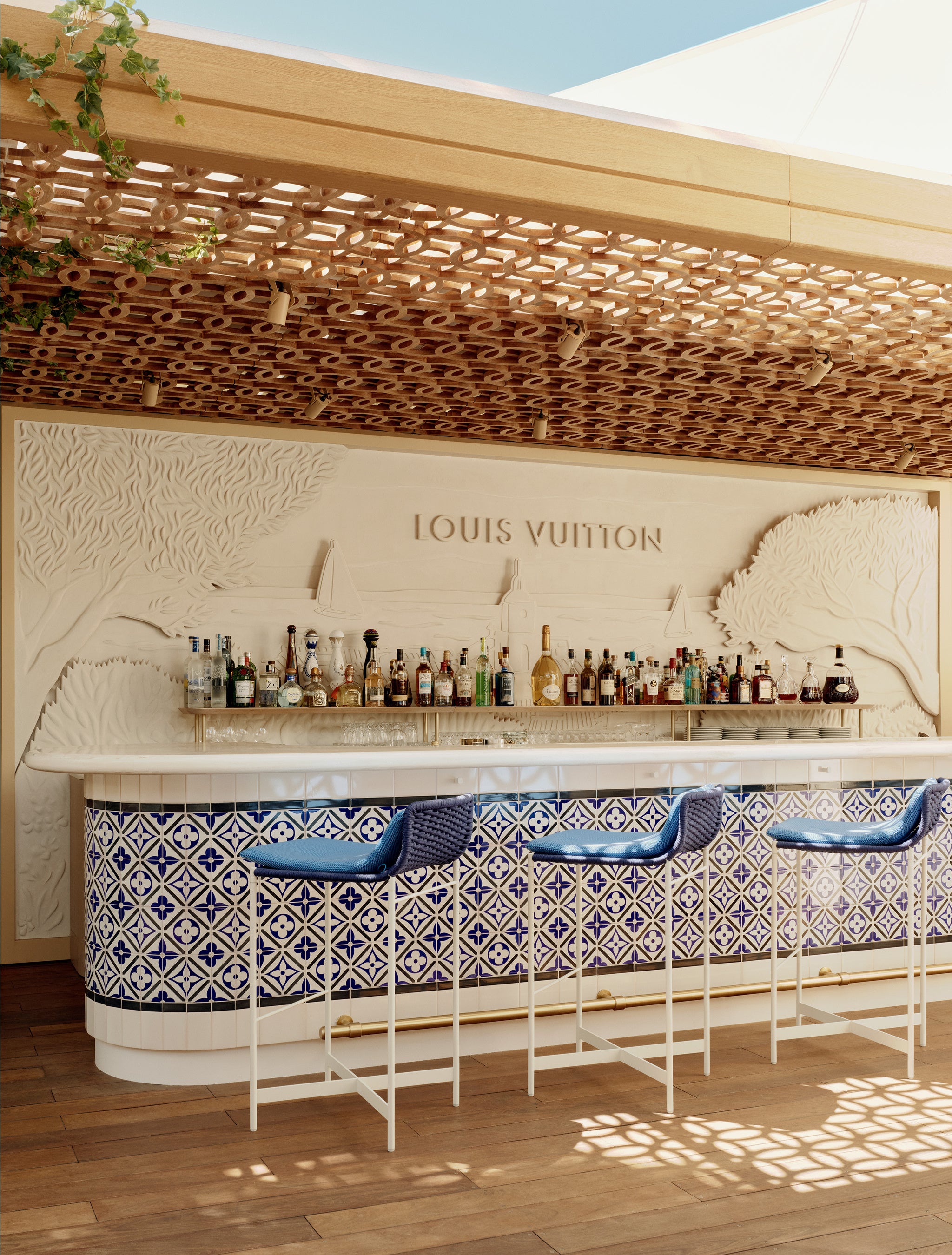 レストランの内装もルイ・ヴィトンの世界観にインスパイアされ、メゾンの新作リゾート・コレクション「LV LV バイ・ザ・プール」に見られるブルー × ホワイトのタイル・パターンを取入れています。このモチーフが、テーブルウェアからガーデンバーの心地良いバーの心地良いクッションまで、いたるところに使われています。ストーン、ウッド、セラミックをふんだんに使用することで、ルイ・ヴィトンが尊重するナチュラルな雰囲気と調和。さらに、ザネラート / ボルトットによる「ランタン」、アトリエ・オイによる「オリガミ・フラワー」など、「オブジェ・ノマドフラワー」など、「オブジェ・ノマド コレクション」のアイテムもそこかしこで華やぎを添えています。