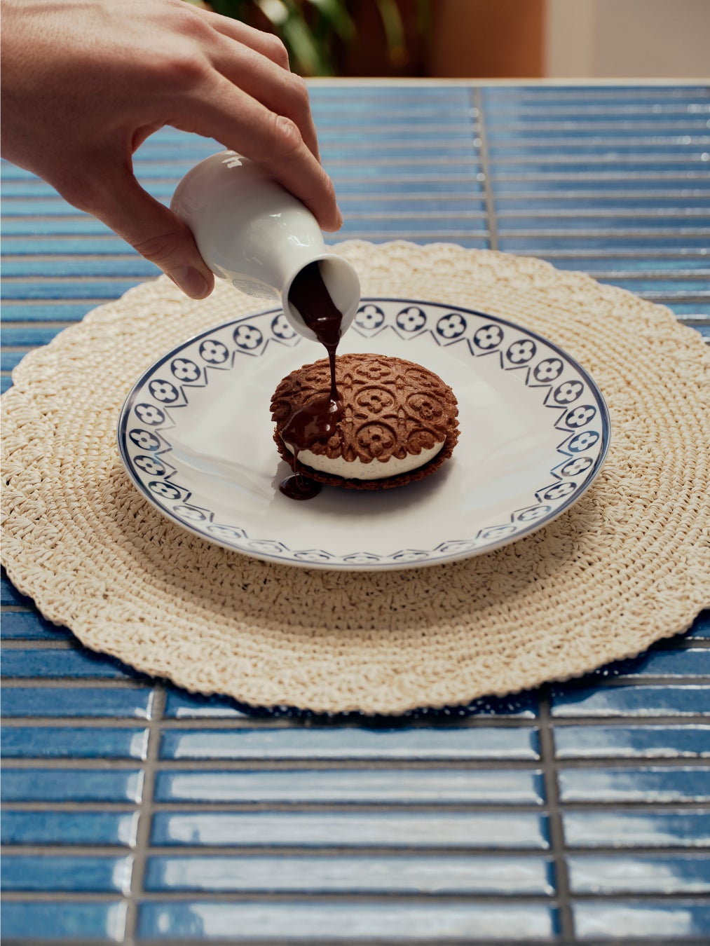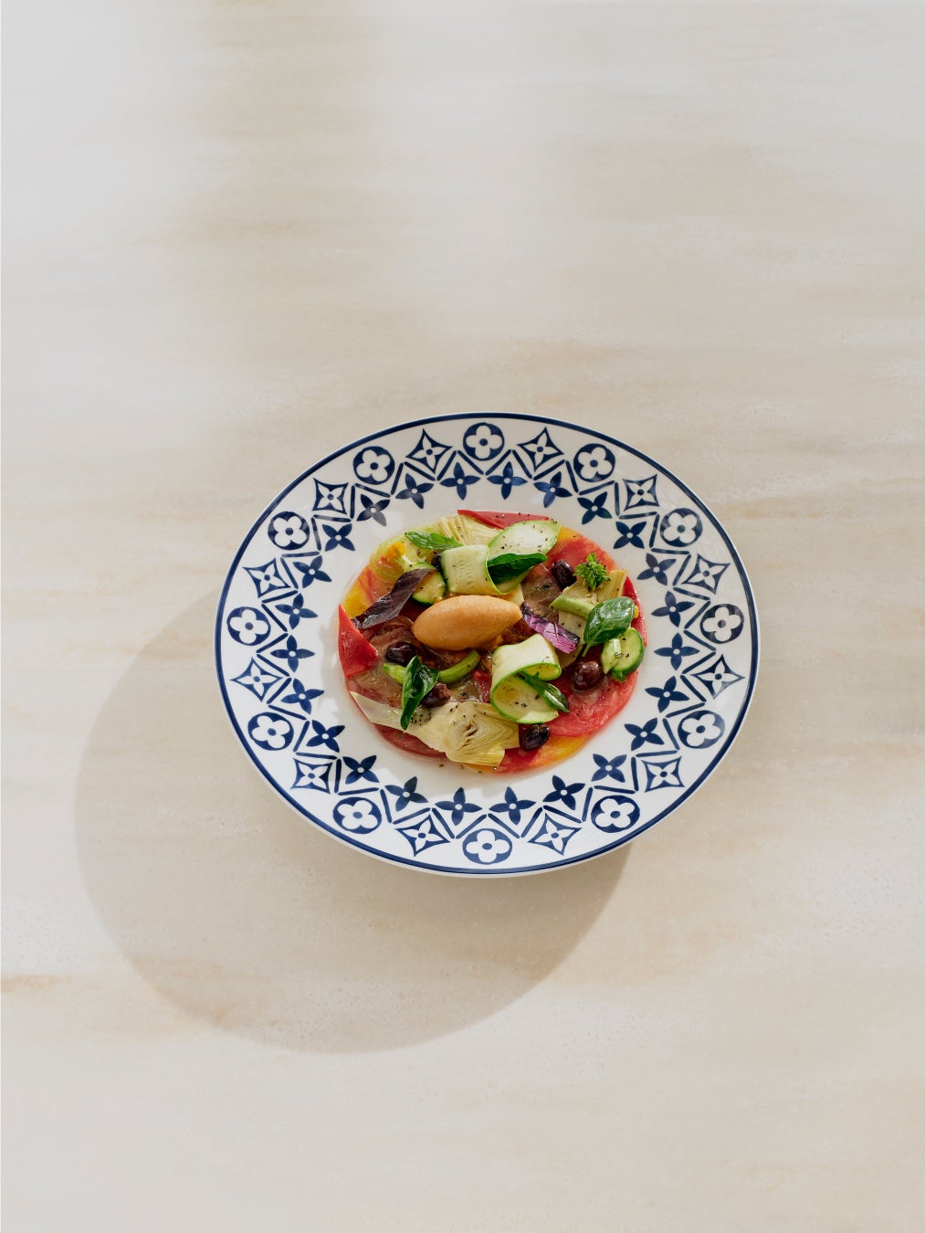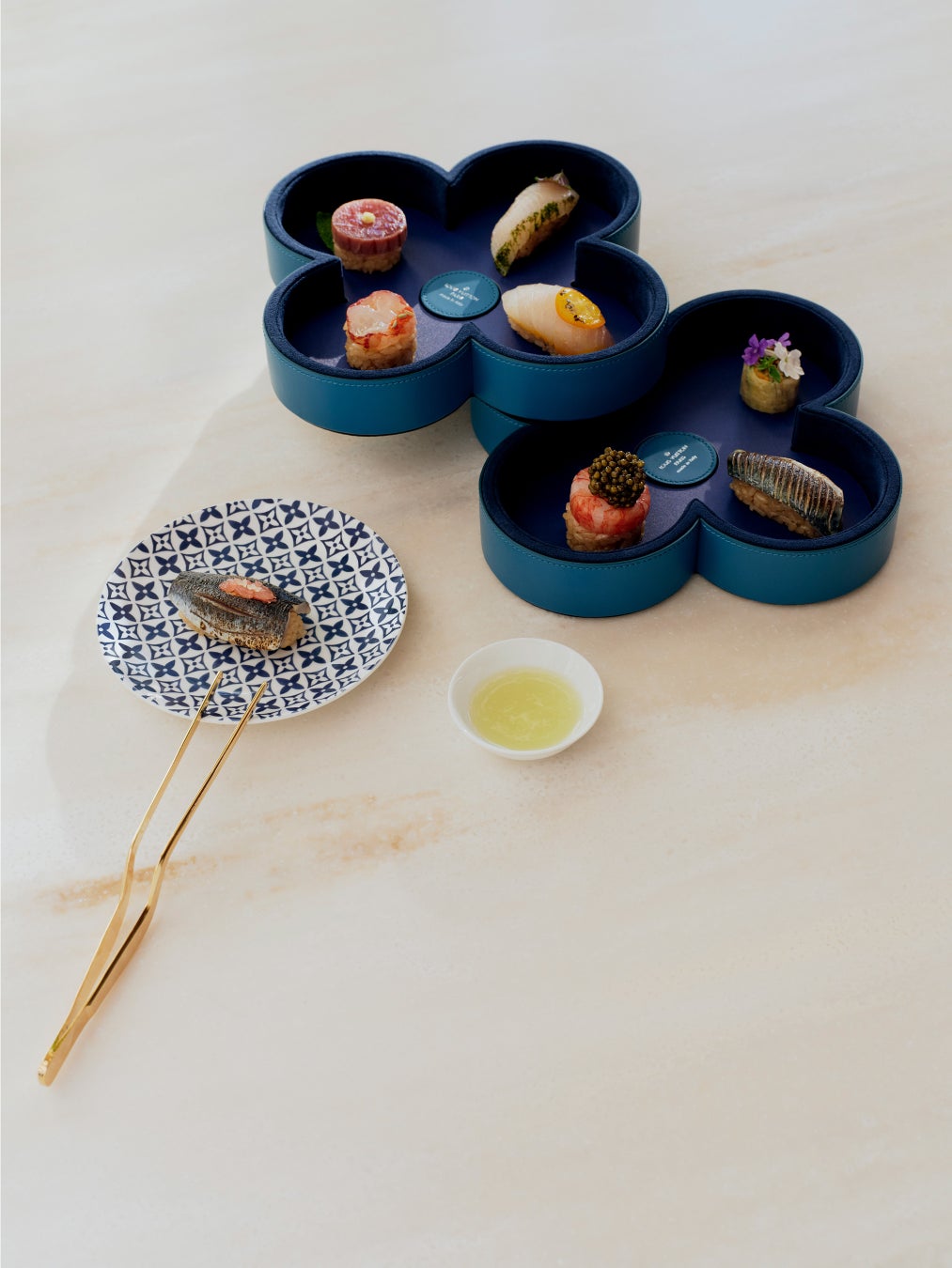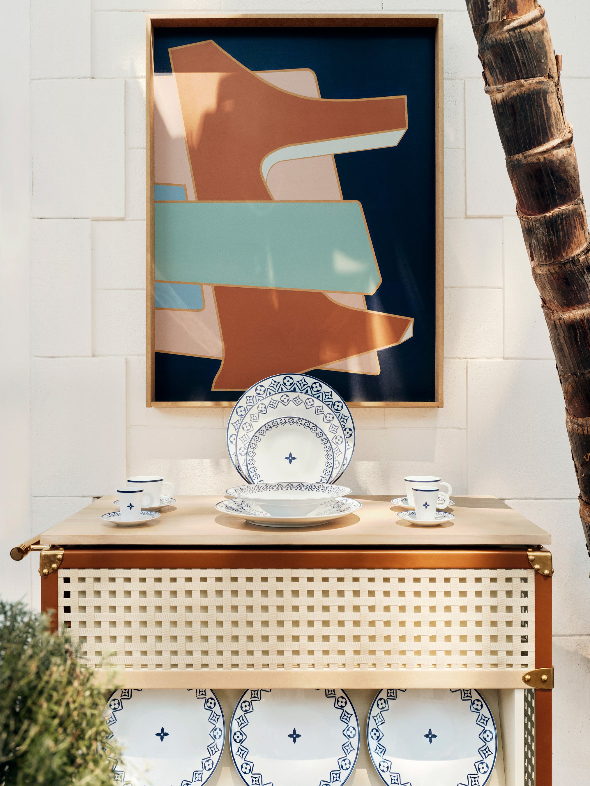 レストランの内装もルイ・ヴィトンの世界観にインスパイアされ、メゾンの新作リゾート・コレクション「LV LV バイ・ザ・プール」に見られるブルー × ホワイトのタイル・パターンを取入れています。このモチーフが、テーブルウェアからガーデンバーの心地良いバーの心地良いクッションまで、いたるところに使われています。ストーン、ウッド、セラミックをふんだんに使用することで、ルイ・ヴィトンが尊重するナチュラルな雰囲気と調和。さらに、ザネラート / ボルトットによる「ランタン」、アトリエ・オイによる「オリガミ・フラワー」など、「オブジェ・ノマドフラワー」など、「オブジェ・ノマド コレクション」のアイテムもそこかしこで華やぎを添えています。