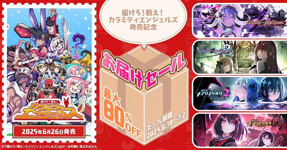 アイディアファクトリー株式会社(代表取締役社長:佐藤 嘉晃/所在地:東京都豊島区)の子会社である株式会社コンパイルハート(取締役社長:冨長 直人/所在地:東京都豊島区)は、本日6月18日(水)よりニンテンドーeショップおよびPlayStation®Storeにて《届けろ!戦え!カラミティエンジェルズ発売記念 お届けセール》を開始いたしました。