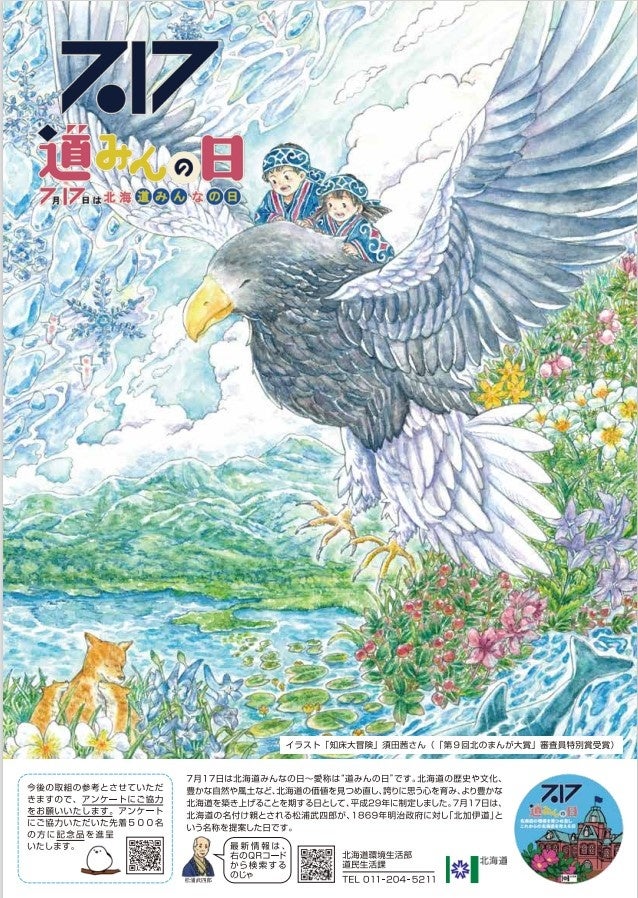 7月17日は、「北海道みんなの日」~愛称は、「道みんの日」です。北海道の歴史や文化、豊かな自然や風土など、北海道の価値を見つめ直し、誇りに思う心を育み、より豊かな北海道を築きあげることを期する日として、平成29年(2017年)に制定された「北海道みんなの日」条例により、定められました。7月17日は、北海道の名付け親とされる松浦武四郎が、明治2年(1869年)、明治政府に対し「北加伊道」という名称を提案した日です。