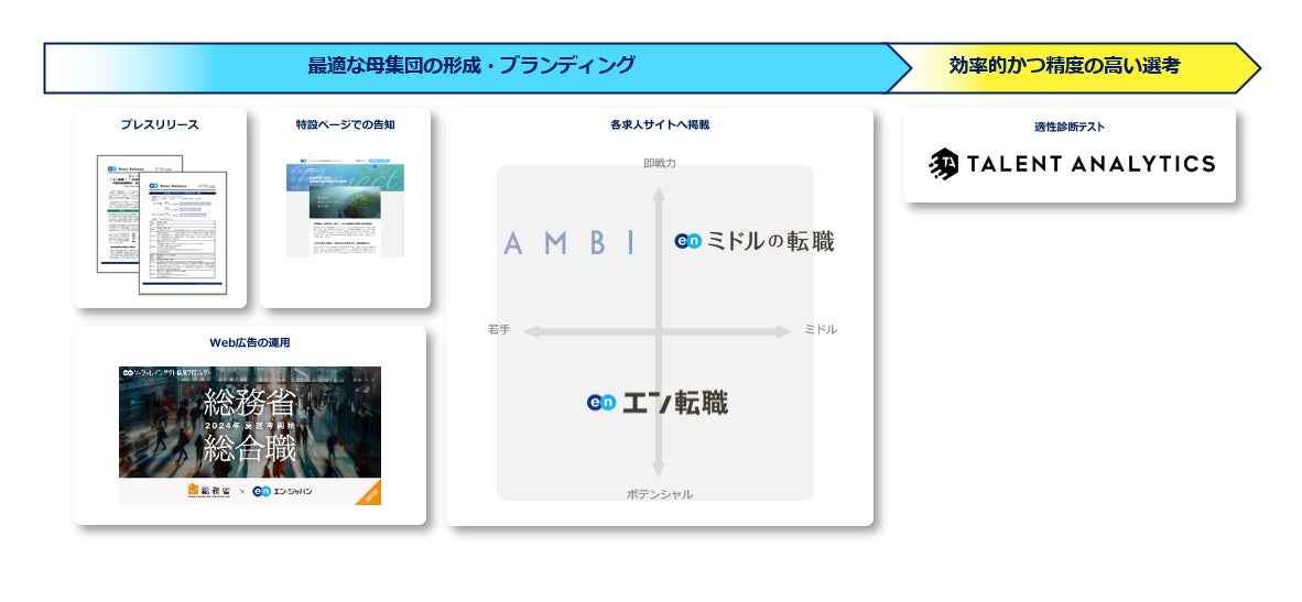 プレスリリースや特設ページ、Web広告での告知に加え、各求人サイトでの集客サポートを実施いたします。『エン転職』『AMBI』『ミドルの転職』とターゲットの異なる3つの求人サイトを活用することで、ターゲットへ網羅的に求人を届けます。さらに適性診断テスト『Talent Analytics』も提供。選考フローの支援を通じて、求職者と同省の最良なマッチングを実施します。