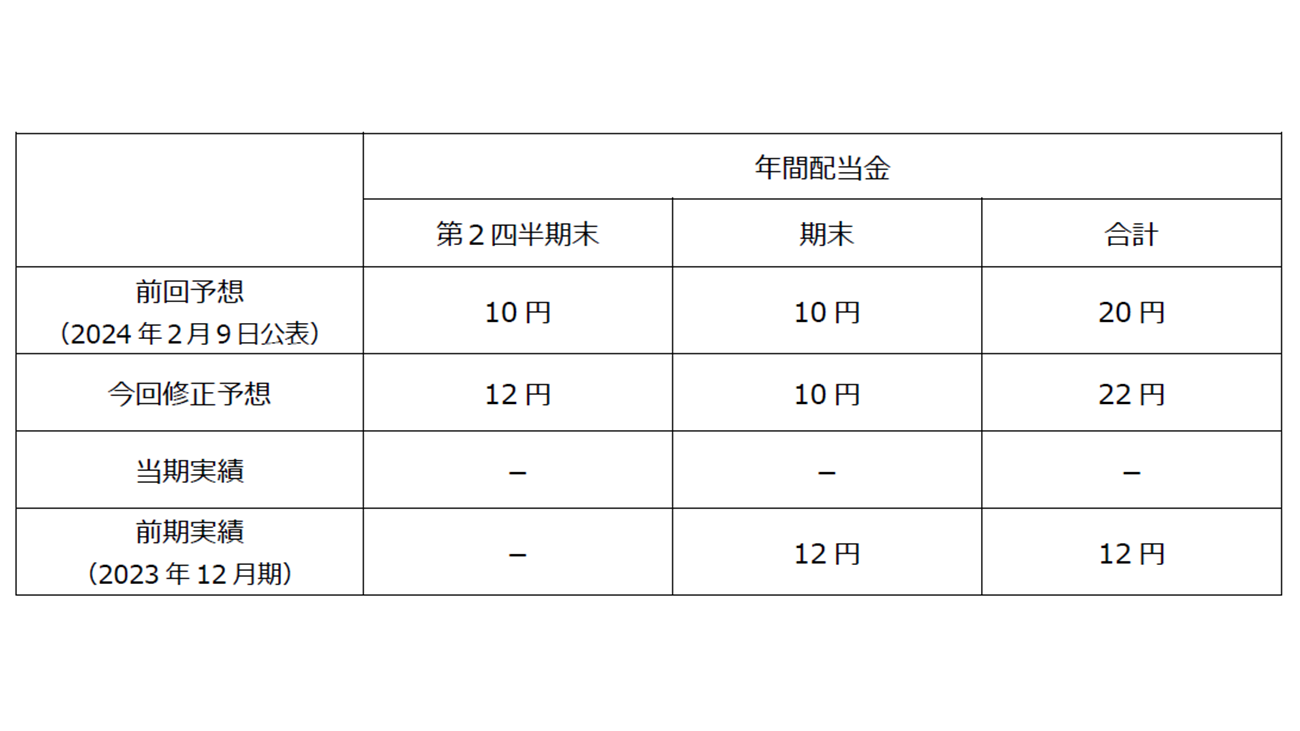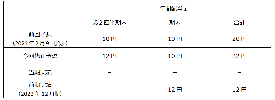 2024 年 12 月期の中間配当につきましては、2024 年 12 月期第1四半期の売上高が過去最高を記録するなど業績が好調であったこと、2024 年6月7日に開示しました「2024 年5月度月次事業進捗レポートのお知らせ」のとおり、2024 年 12 月期第2四半期の売上高が堅調に推移していること及び今後の見通し等を総合的に勘案し、1株当たり2円の増配を実施することといたしました。これにより年間配当金は 22 円となる予定であります。