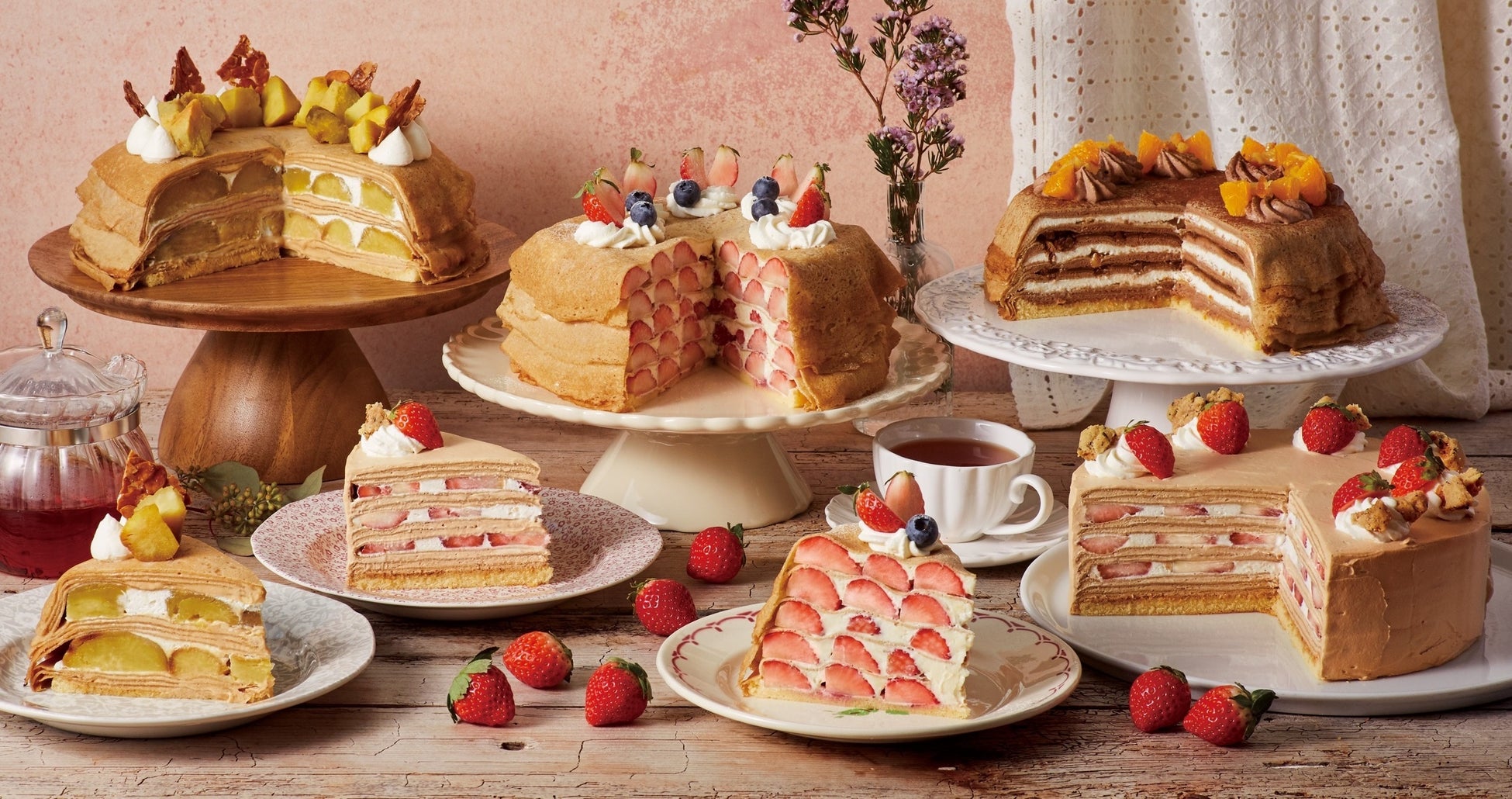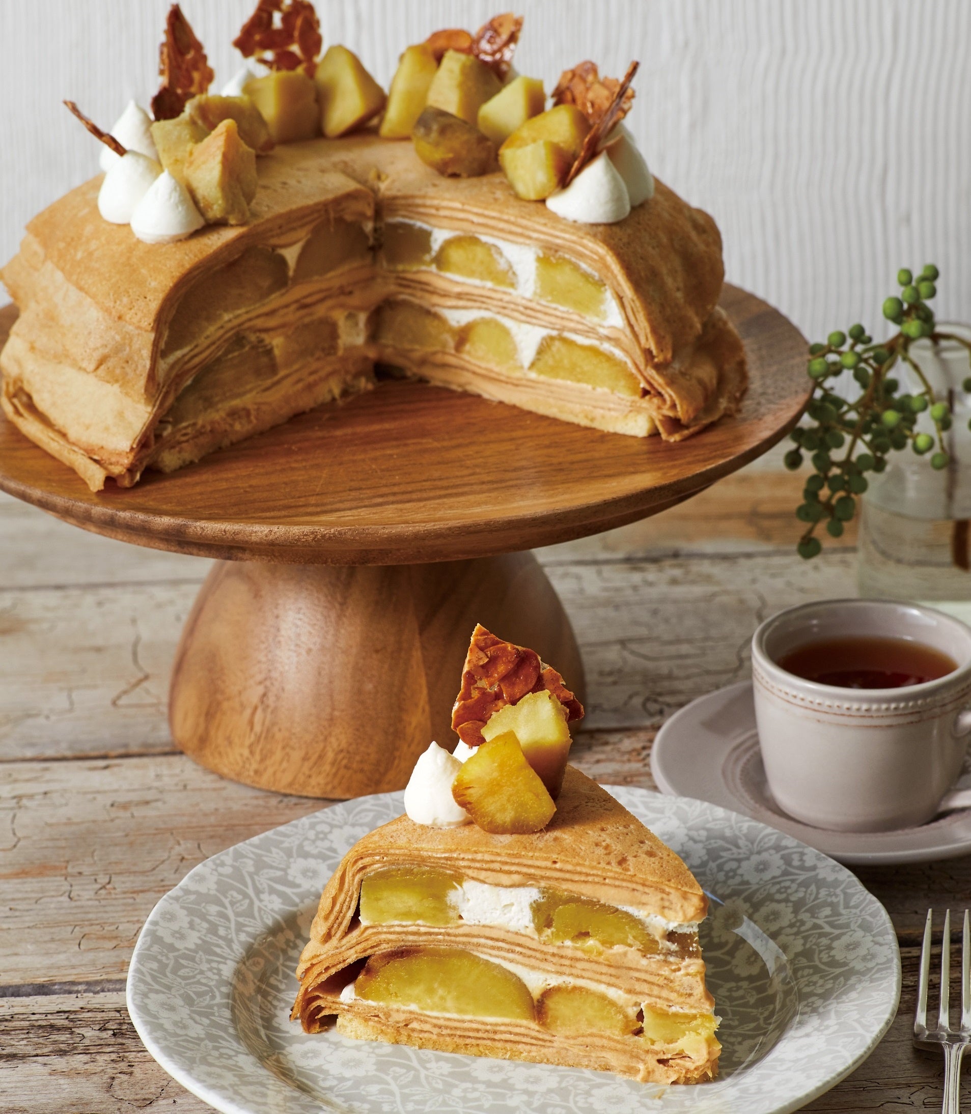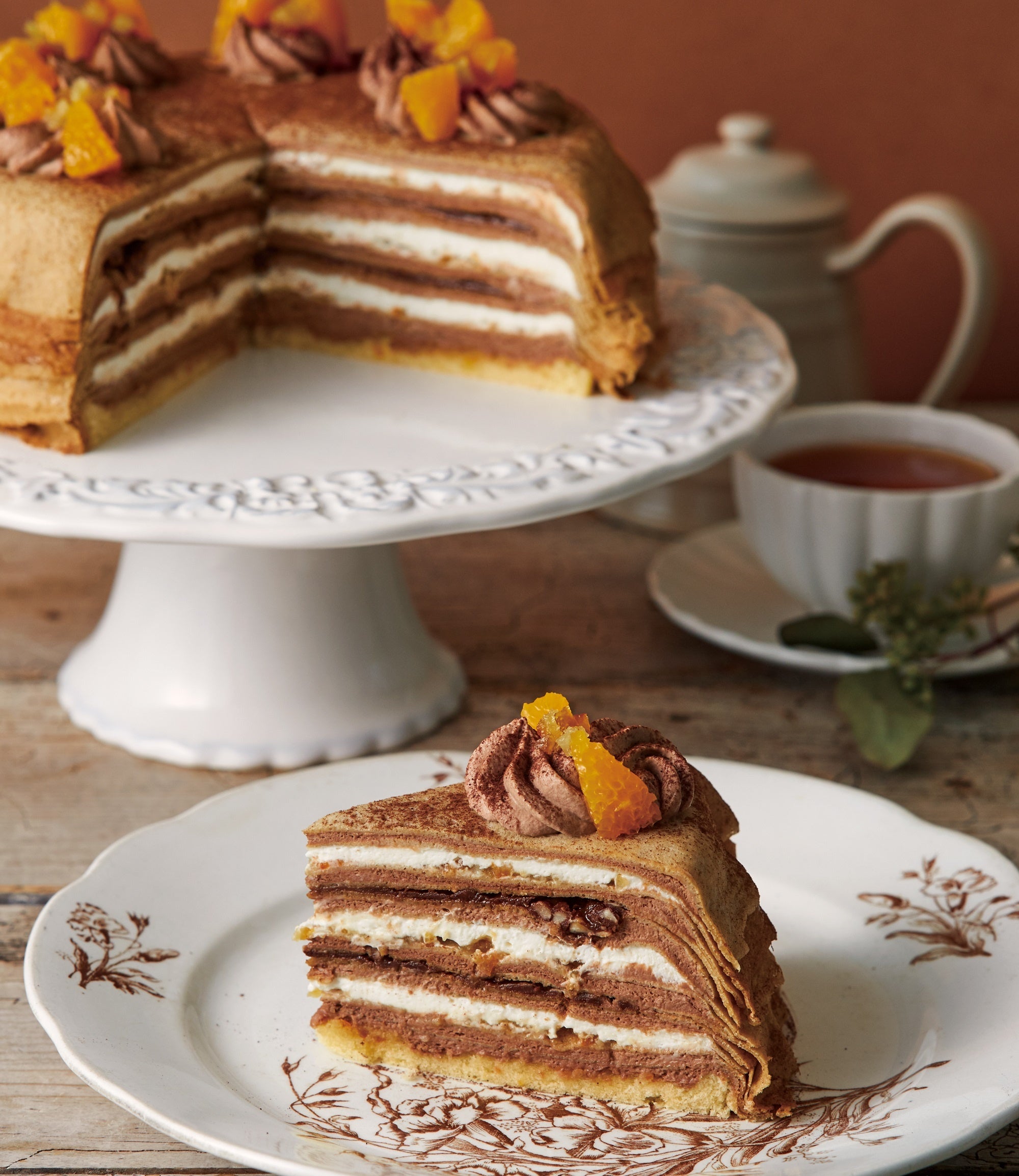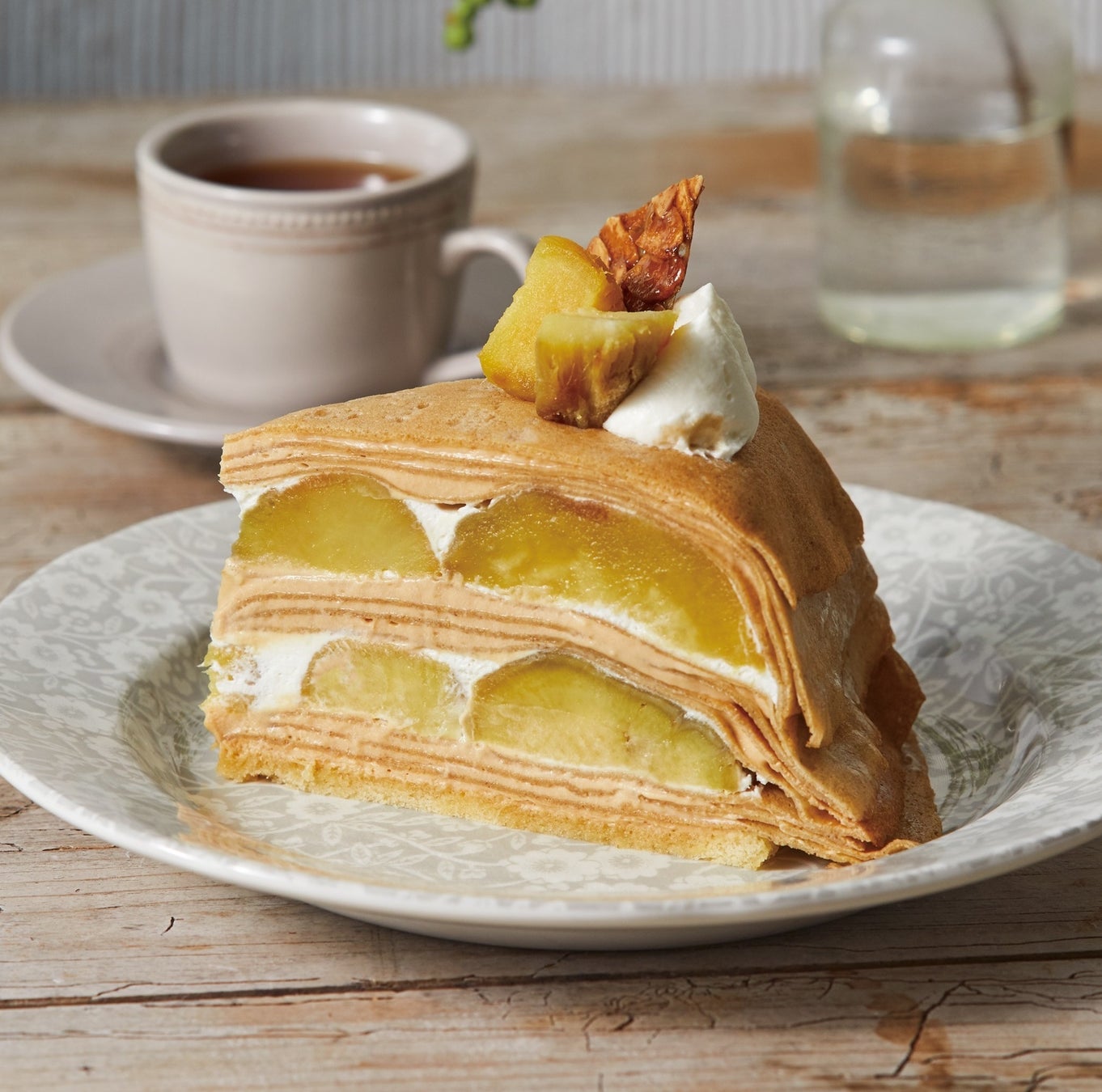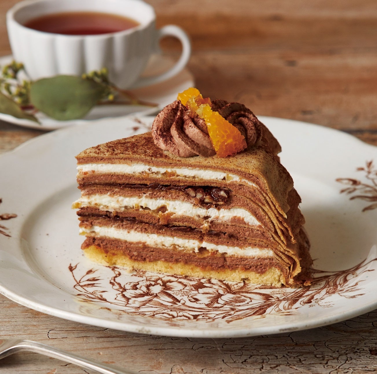 この冬は、甘くしっとりとした紅はるかの焼き芋にほろ苦い自家製キャラメルクリームをあわせた新作「自家製キャラメルクリームと焼き芋のミルクレープ」と、ベルギーのカレボー社製スイートチョコで作るチョコレートクリームをクレープと重ねた「オレンジとヘーゼルナッツのチョコレートミルクレープ」が期間を変えて順次登場します。