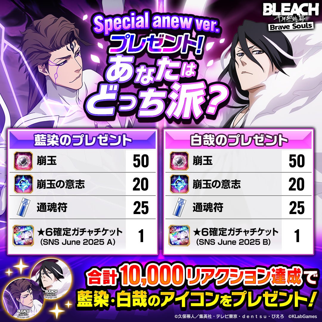 また、ブレソル公式SNSでは「Special anew ver.プレゼント!あなたはどっち派?」もスタートしました。全世界で合計1万リアクションを達成すると、藍染と白哉のSNS用アイコンを配布しますので、奮ってご参加ください。