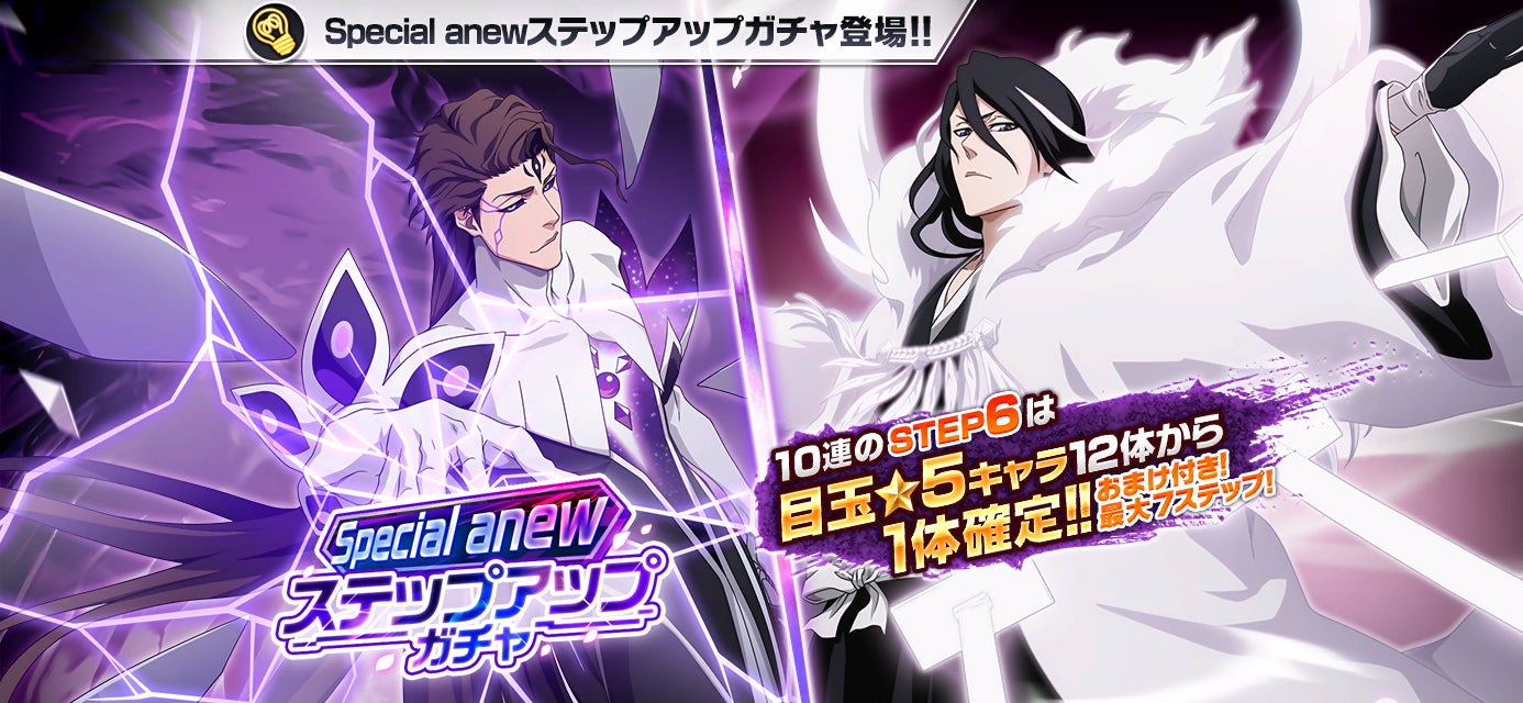 初回無料、新★5キャラクターには、藍染惣右介 Special anew ver.、朽木白哉 Special anew ver. が登場します。10連はSTEP6で目玉★5キャラクター12体から1体が確定!