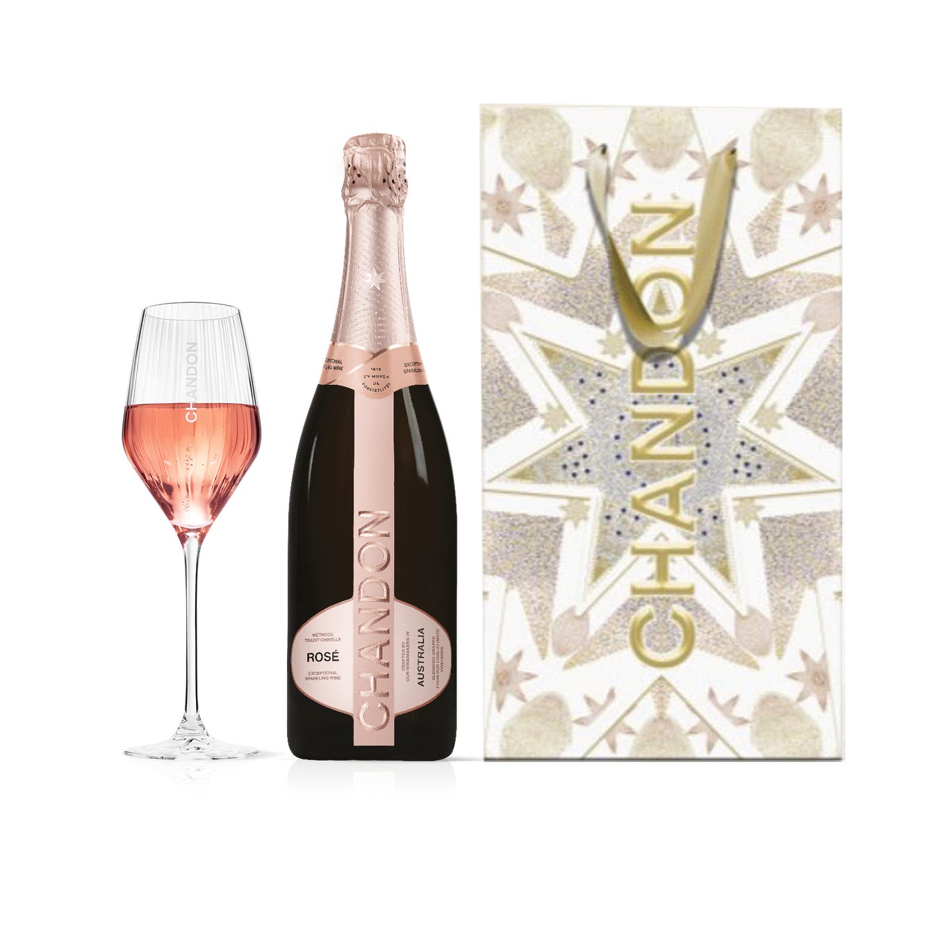 「シャンドン ブリュット」または「シャンドン ロゼ」と、エレガントなシャンドン専用グラスを組み合わせた限定セット。贈り物にも最適なオリジナルショッパー付きです。