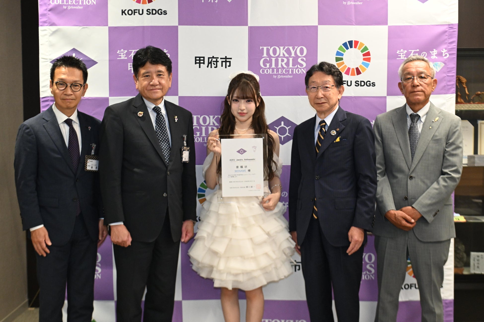 本日、甲府市役所で実施した委嘱状交付式には、樋口雄一(ひぐちゆういち)甲府市長、甲府商工会議所会頭の進藤中(しんどうなかば)氏、山梨県ジュエリー協会理事長の柳本力(やなぎもとちから)氏らが登壇。樋口市長はこの先の活動について、「昨年初めて開催いたしましたジュエリーデザインコンテスト、『宝石のまち甲府ジュエリー甲子園』の全国大会を実施予定です。本市ではこのイベントを通じて、高校生の想像力や才能を育みながら、本市の代表的な産業であるジュエリー産業への関心を高めていただくことで、“宝石のまち甲府”の認知度向上や次世代の担い手育成、ふるさと納税の拡大にも繋げていきたいと考えています。本年度もMINAMIさんには、東京ガールズコレクションでのPRに加えて、その他イベントでもお力添えいただきますよう、お願い申し上げます。」と、進藤中氏は甲府ジュエリーについて「ジュエリーを身につける高揚は色々あると思いますが、自分自身を着飾るだけでなく、人生を語る上でも大切なものだと思います。MINAMIさんには若者の代表として、甲府ジュエリーを身につけることへの高揚、ファッション性を多くの方に知っていただけるよう、頑張っていただきたいと思います。」と期待を込めました。