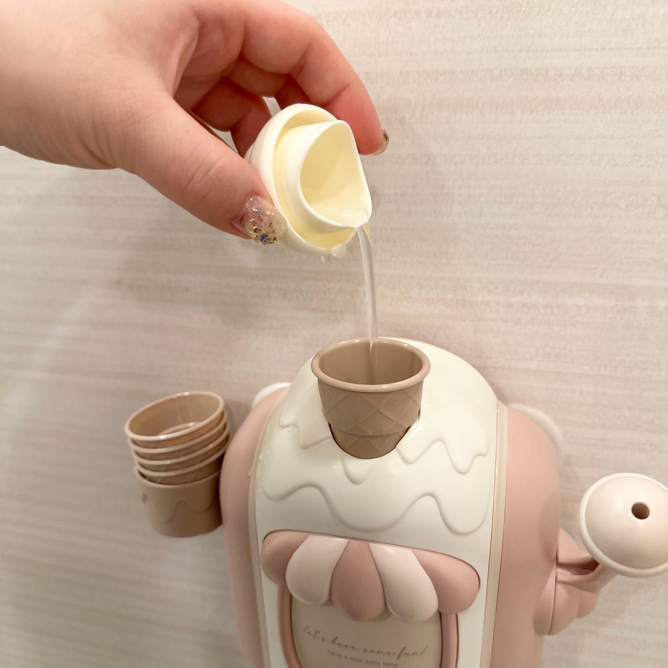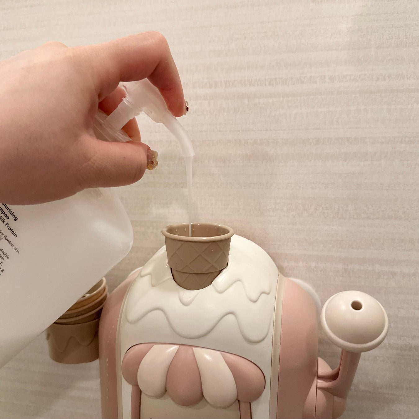 ②蓋上部を開けて水を入れ、次にボディーソープを加えて蓋をします。