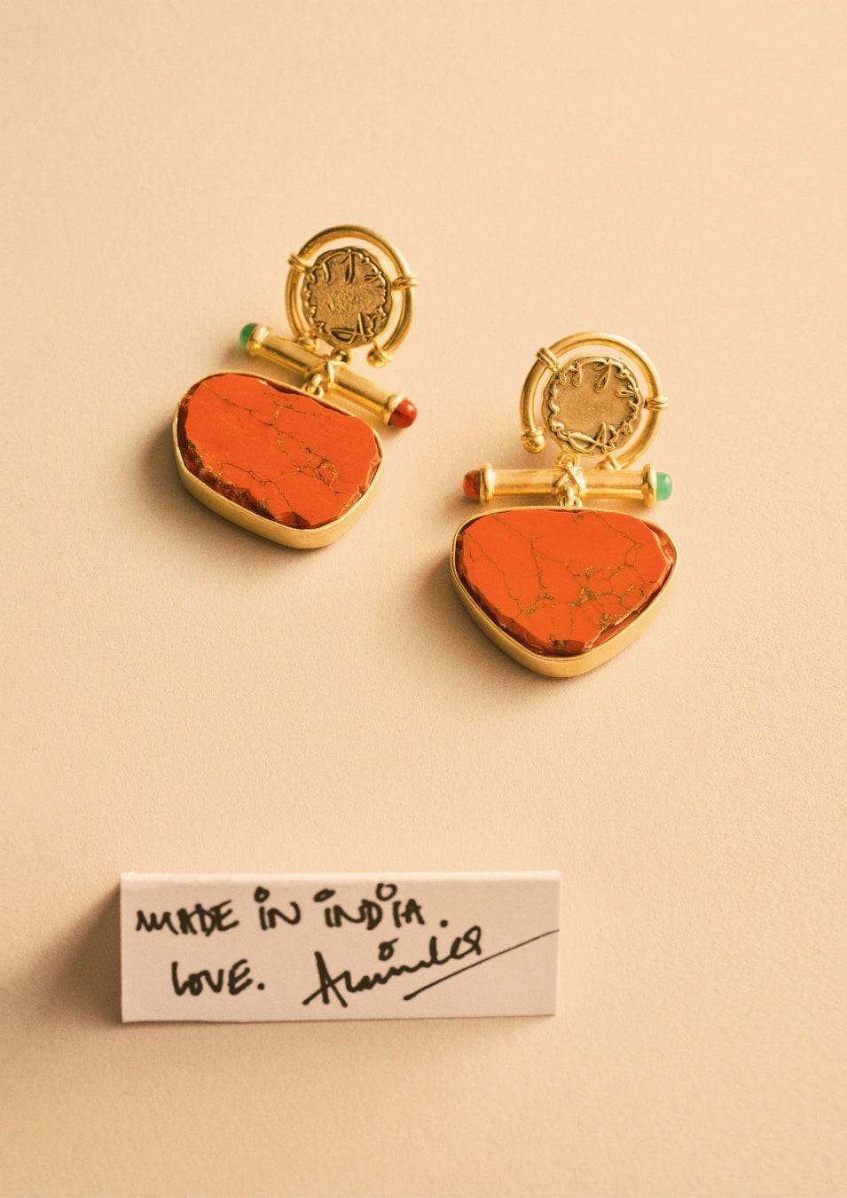アナミカ・カンナのトレードマークである華々しい装飾品は、現地インドで再生金属を使用して作られたイヤリングやブレスレットなどのジュエリーとして登場します。