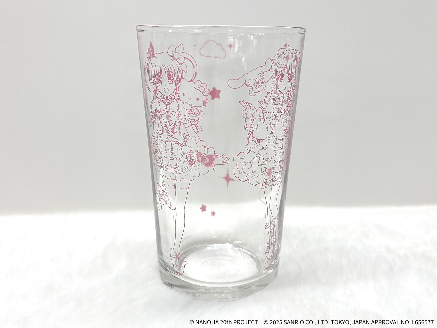 直径7.3cm×高さ12cmのグラスに、「なのは×ハローキティ」&「フェイト×シナモロール」の等身イラストをシンプルにデザイン。