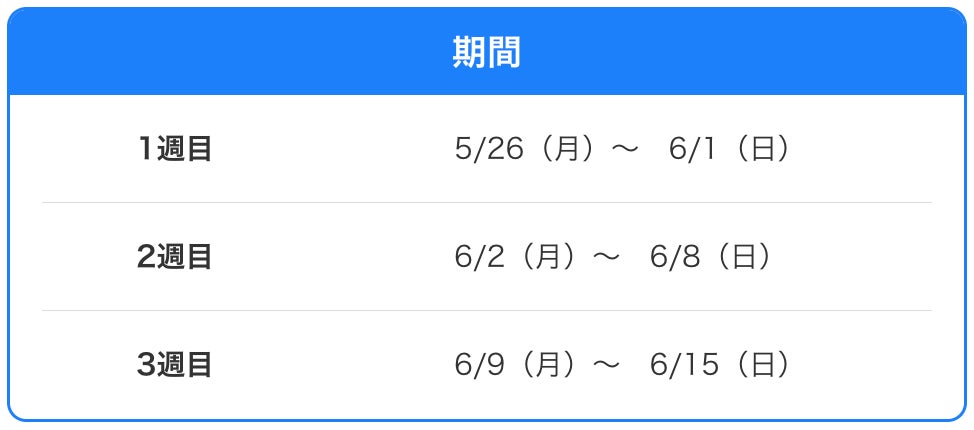 2025年 5月 26日 (月) 13:00 ~ 2025年 6月 15日 (日) 13:00