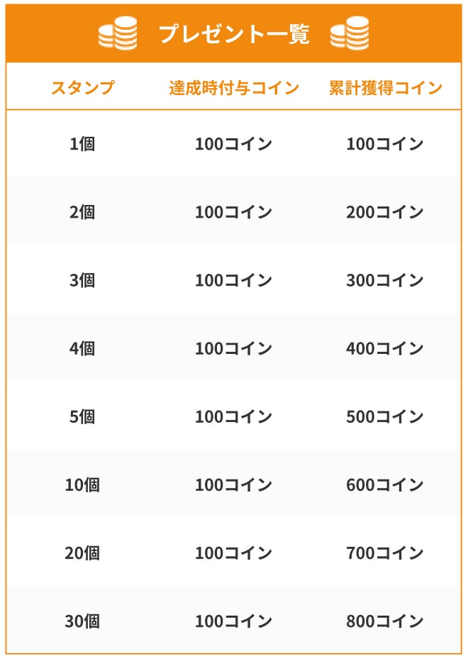 獲得スタンプ数に応じてもれなくコインをプレゼント。