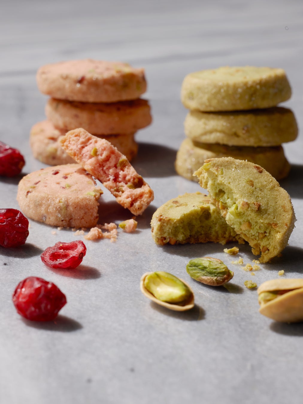 ピスタチオ&ピスタチオ:ローストピスタチオペーストとピスタチオプラリネペーストの2種使用し、奥深いあじわいを出したクッキー生地に、刻んだローストピスタチオを練り込み、香ばしさをプラスし焼き上げたクッキーです。 ピスタチオ&クランベリー:ドライクランベリーを練り込んだクッキー生地に刻んだローストピスタチオを加えベリーの風味がピスタチオの香ばしさを引き立てるあじわいへと仕上げました。