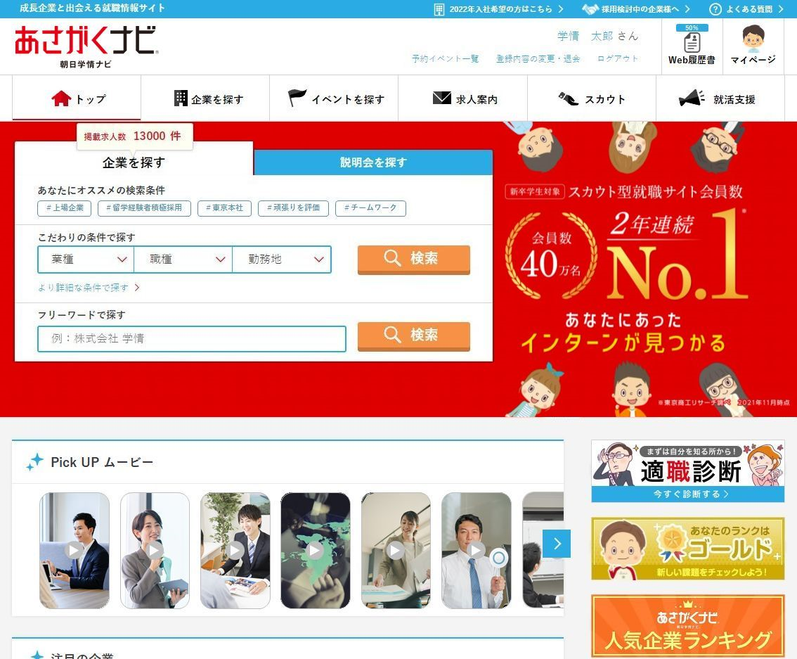 会員数40万名の、ダイレクトリクルーティングサイト会員数2年連続No.1の新卒採用サイト。「あさがくナビ」は動画型ダイレクトリクルーティングサイトとして、動画を通して、リアル(企業の雰囲気や社員の声)を体感できるコンテンツを拡充させています。また、「スカウト」と「職種別掲載」で企業にマッチする優秀人材の採用を支援。テレワークの普及・定着で注目が高まる“ジョブ型採用”を可能にする、職種別掲載機能を実装するなど、マッチング精度のさらなる向上に取り組んでいます。朝日新聞のその日の記事から社会や業界に関してのトピックスを就活目線でわかりやすく解説した「今日の朝刊」など、就活ノウハウだけでなく、社会や世の中を知るためのコンテンツを提供しています。
