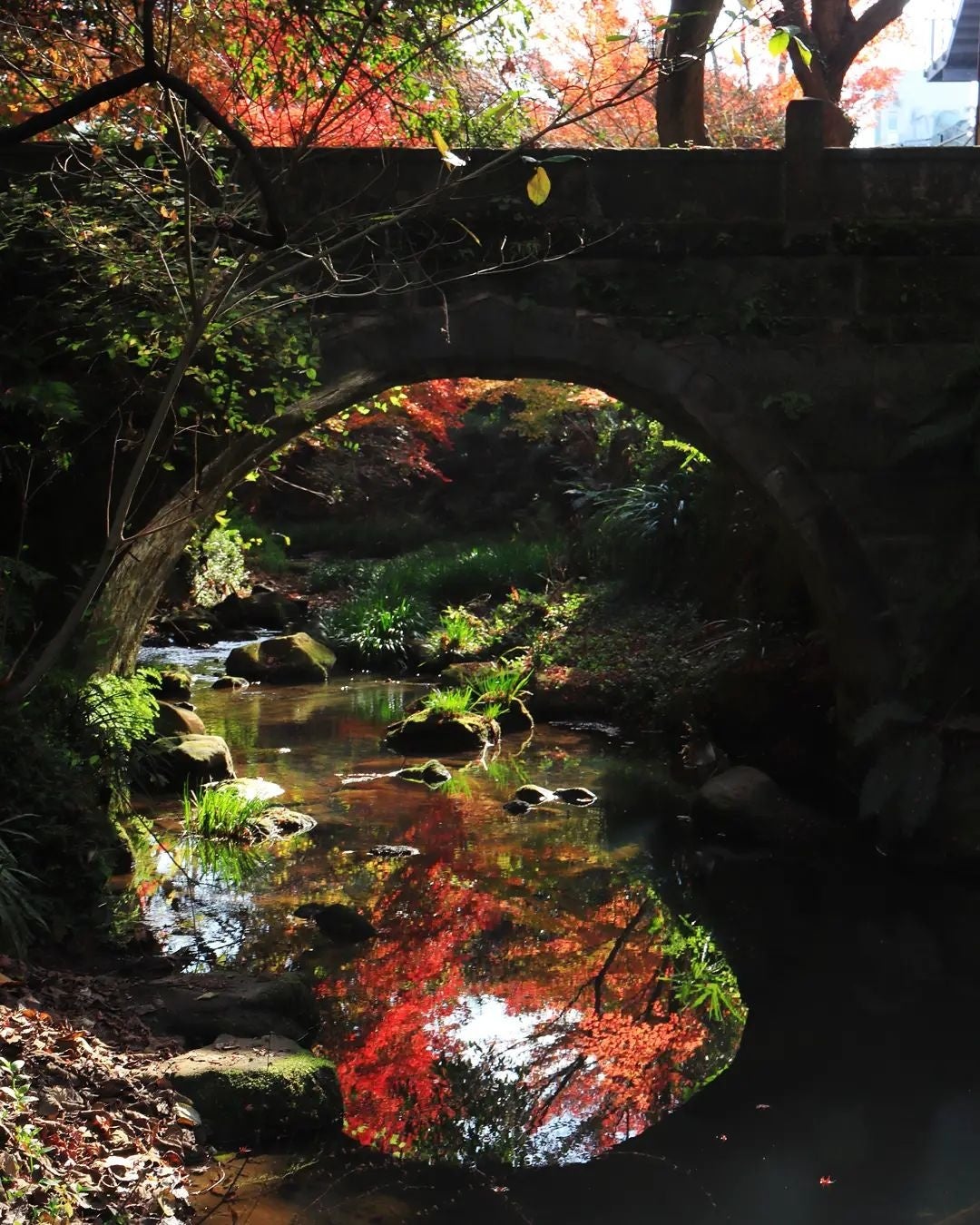 緑に覆われた昇龍橋はよく拝見する写真ですが、橋と紅葉をとらえた一枚が目に留まり選出。方向が逆光になるため、赤く染まった木々や植物は色鮮やかに表現されていますが、橋はシル エットになっています。