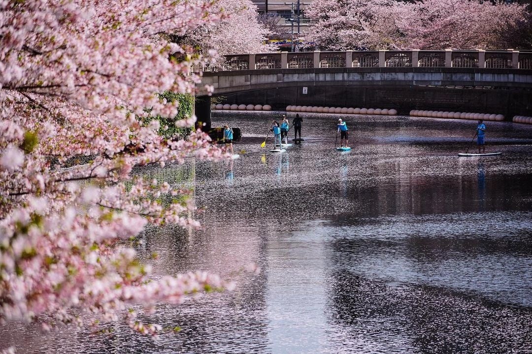 サップを楽しむ人たちを入れたことで視線が奥に向かい、橋の存在も強調されています。画面に余計と思われる被写体がなく色数を抑えているので、全体にまとまりがあります。