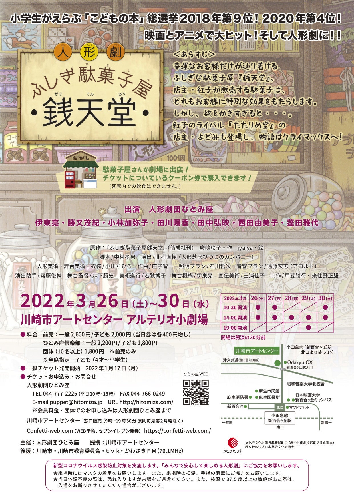 人形劇団ひとみ座 人形劇「ふしぎ駄菓子屋銭天堂」が2022年3月26日(土)~3月30日(水)に川崎市アートセンター・アルテリオ小劇場(神奈川県川崎市)にて上演されます。チケットはカンフェティ(運営:ロングランプランニング株式会社、東京都新宿区、代表取締役:榑松 ⼤剛)にて発売中です。