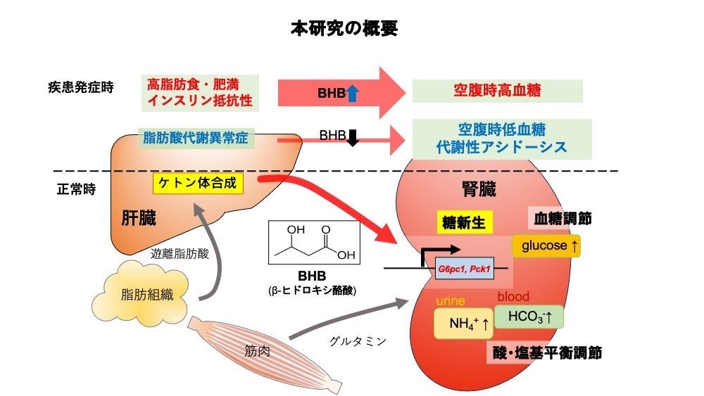 研究グループは、空腹時の血糖維持に関わる腎糖新生の調節に肝臓で合成されるケトン体(注2)が、空腹時の代替エネルギー源としてだけでなく、生理活性物質として血糖調節や血液の酸性化(アシドーシス)を防ぐという重要な役割を担っていることを新たに発見しました。