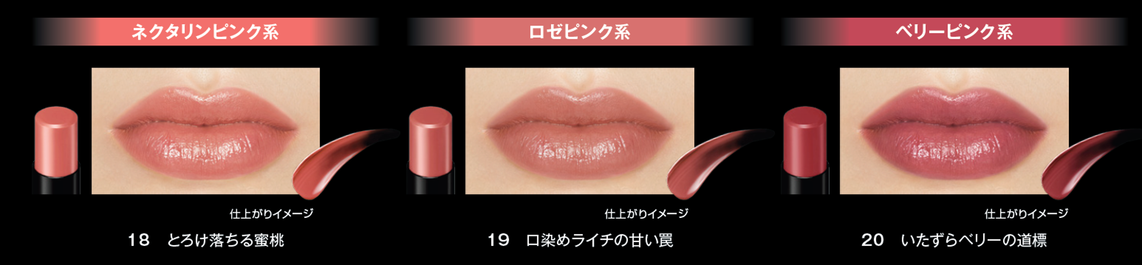 今回登場するのは、ネクタリンピンク系の「18 とろけ落ちる蜜桃」、ロゼピンク系の「19 口染めライチの甘い罠」、ベリーピンク系の「20 いたずらベリーの道標」の3色。新色を加え、「リップモンスター」は全20色(うちWEB限定9色)展開になります。さらに、口紅の上から重ねるだけで色・質感変化。モンスター化して落ちにくい、‟色化けモンスター“「リップモンスターカラートナー」の限定色も同日発売いたします。