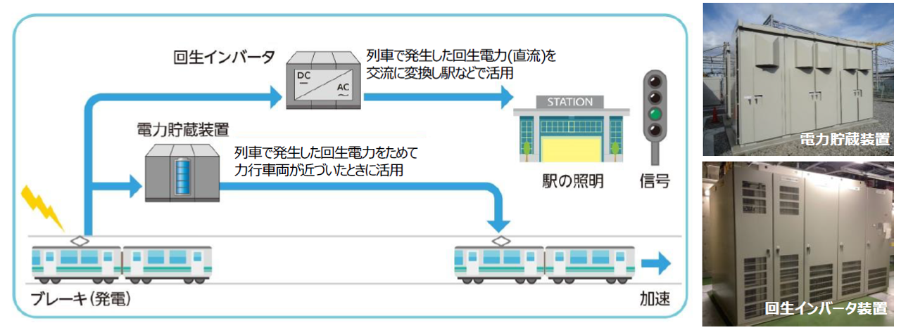 き電電圧低減による回生電力有効利用のほか、回生車両の近傍に力行車両が存在しない場合などに、一時的に充電して加速する列車に供給する電力貯蔵装置や、駅などに供給する回生インバータ装置の導入も進めています。これまでに、電力貯蔵装置4台、回生インバータ3台を導入しています。