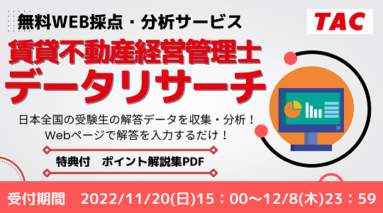 賃貸不動産経営管理士対策講座を展開しているTAC株式会社(東京都千代田区、代表取締役:多田敏男)は11/20(日)に実施される『令和4年度 賃貸不動産経営管理士試験』の解答速報を試験当日にTACのWebサイトで公開いたします。さらに、「難易度」「各分野の所感」などをお伝えする『本試験講評会』を同日に開催、その模様をLIVE配信いたします。ぜひご覧ください!