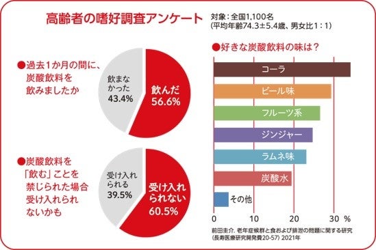 国立長寿医療研究センター老年内科の前田圭介氏(医師)が実施した、高齢者の嗜好調査アンケートによると(※1)、56.6%の方が過去1か月間に炭酸飲料を飲んでいると回答し、仮に炭酸飲料を飲むことを禁じられた場合「受け入れられない」と回答された方は60.5%にもおよびました。また、炭酸飲料の中でもコーラが最も好きな味として選ばれるなど、若者に好まれる印象が強い炭酸飲料ですが、高齢者の嗜好にもマッチしていることが確認できました。ただし、嚥下機能の低下により飲み込みにくくなると、好きな炭酸飲料を諦めるしかなかったという声も当社に寄せられていました。多くの方の飲みたいという想いに応えるため、今回の製品発売に至りました。