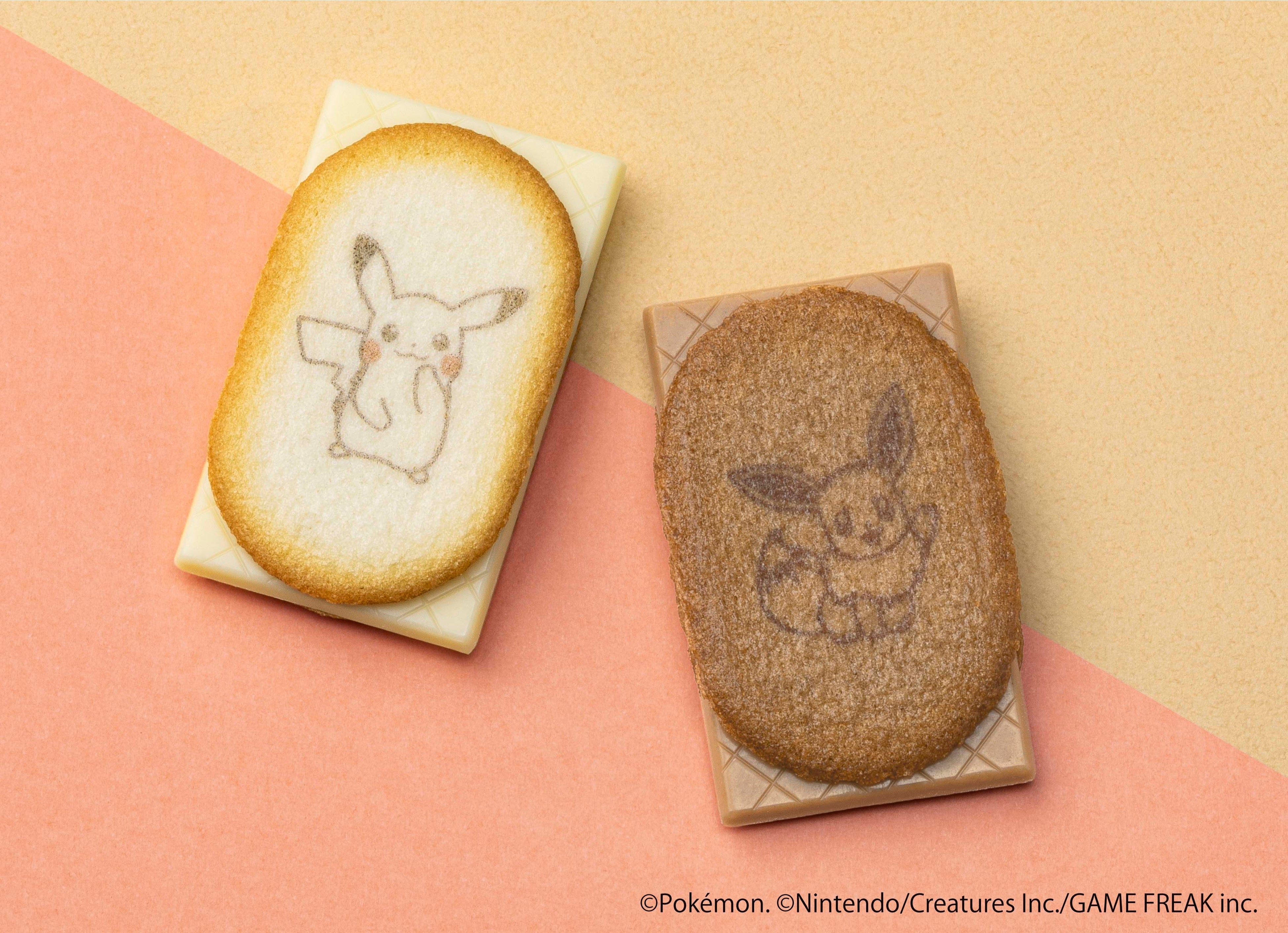 ピカチュウとイーブイがそれぞれ描かれたシャリシャリッと軽やかなラングドシャクッキー。バナナヨーグルト味とキャラメルマキアート味のチョコレートをサンドしました。