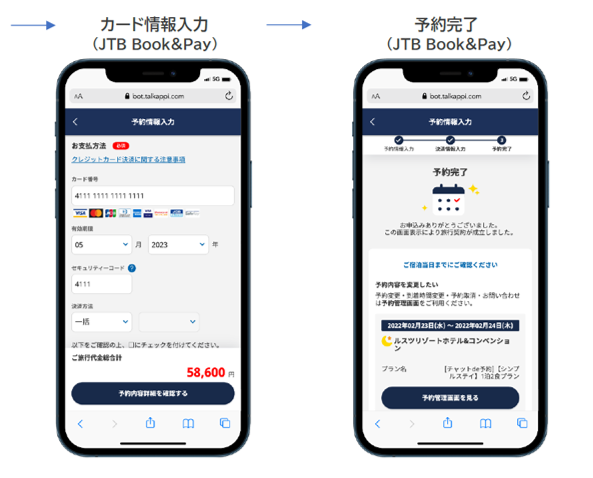 「JTB Book&Pay」は、宿泊施設の公式ホームページで、宿泊予約と同時にクレジットカード決済を可能にするサービスです。従来から宿泊業界の大きな課題であった無断キャンセルやノーショウ対策の一助として2011年にサービス開始。現在では宿泊施設の加盟店数が3,000軒を超え、年間延べ88万人(*2)の旅行者の皆様にご利用頂いております。更に10周年を迎えた2021年11月にUI/UXの向上とセキュリティ強化を中心に、基幹システムの大幅刷新を行い、利便性が向上したとご評価頂いております。今後も宿泊施設及び利用するお客様のさらなる満足度向上の実現に貢献していきます。