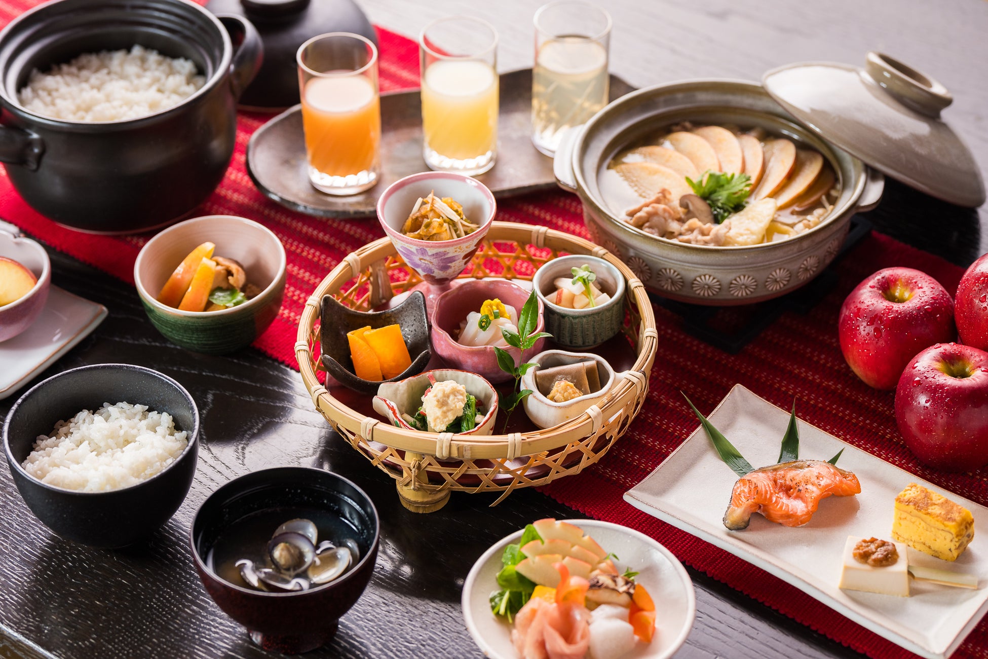 「シャキッとりんご朝食」では、りんごを使った料理とデザート計8品を用意します。メインの「りんご鍋」は味噌ベースのまろやかな味で、りんごのシャキシャキとした食感と甘みを楽しめるのが特徴です。その他、梅肉の酸味が効いた「りんごと長芋梅肉和え」や豆腐のさっぱりした味とりんご味噌の甘さを楽しめる「りんご味噌豆腐田楽」、野菜とりんごを楽しめる「りんごと生ハムのサラダ」なども味わえます。食後には、オーブンでじっくり焼いて甘みが増した焼きりんごにバニラアイスクリームを添えたデザートが堪能できます。りんご尽くしの料理で健やかな一日の始まりを感じられる、秋限定の特別な朝食です。