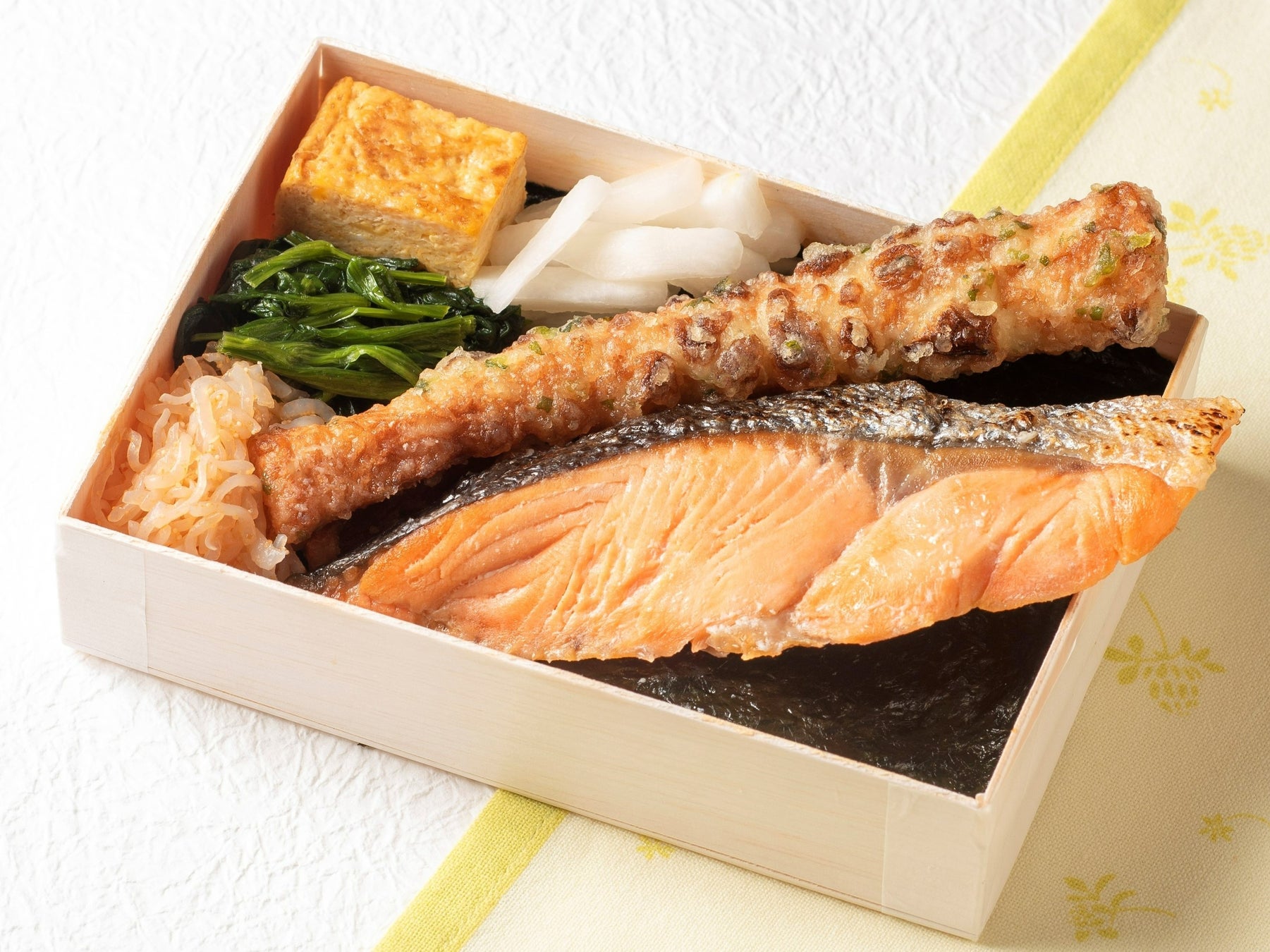 脂ののった鮭が弁当箱からはみ出るほどの海苔弁、魚屋自慢の海鮮ばらちらしなど、魚メインの定番弁当も充実!