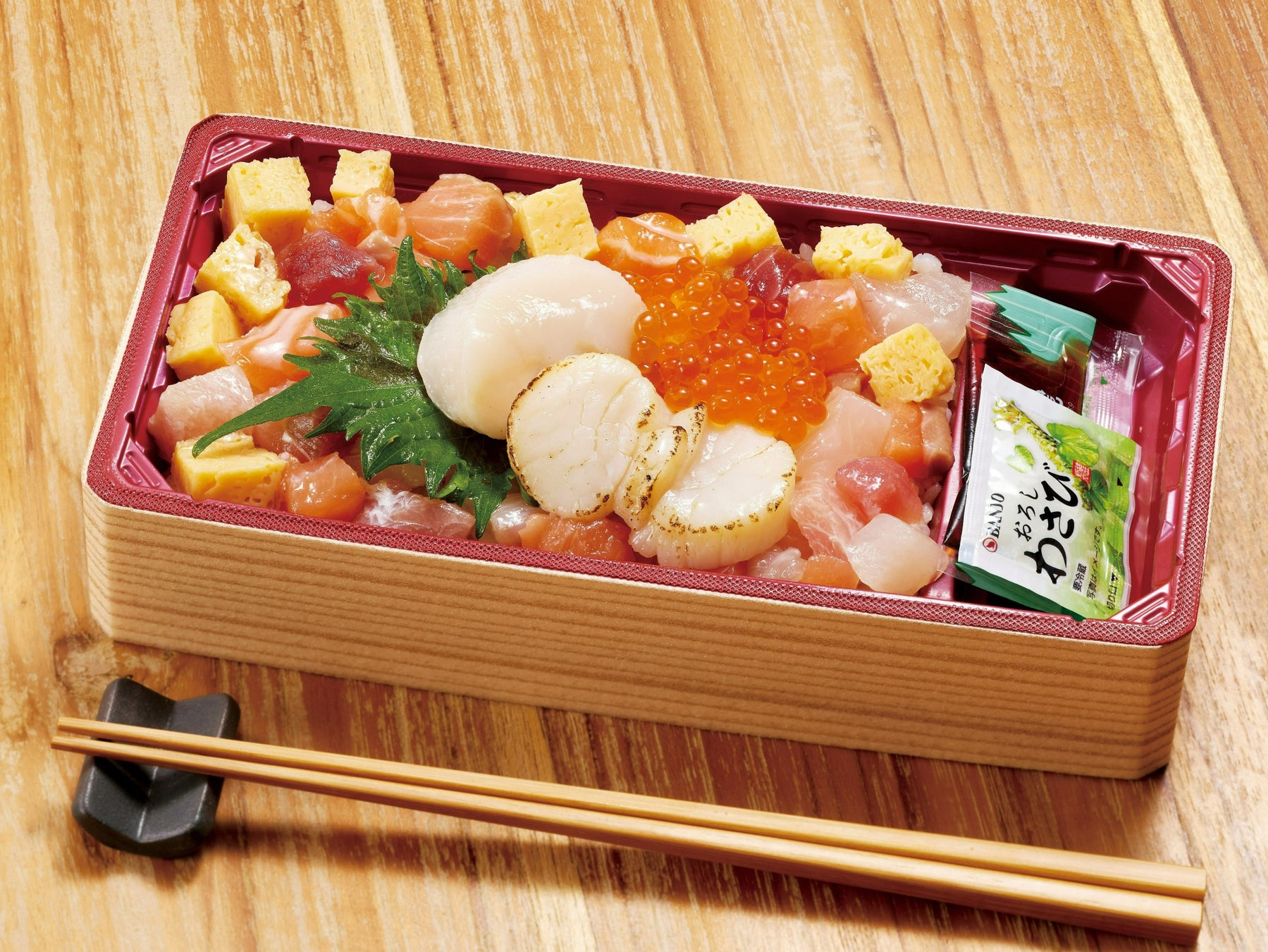 炙り帆立やいくら、まぐろ、生アトランティックサーモンなど魚屋自慢の鮮魚をたっぷり盛り込んだ、人気の海鮮ばらちらしです。全国の漁港から集めた、鮮度や質のよい魚介、季節の鮮魚を使った海鮮丼が人気のショップです。