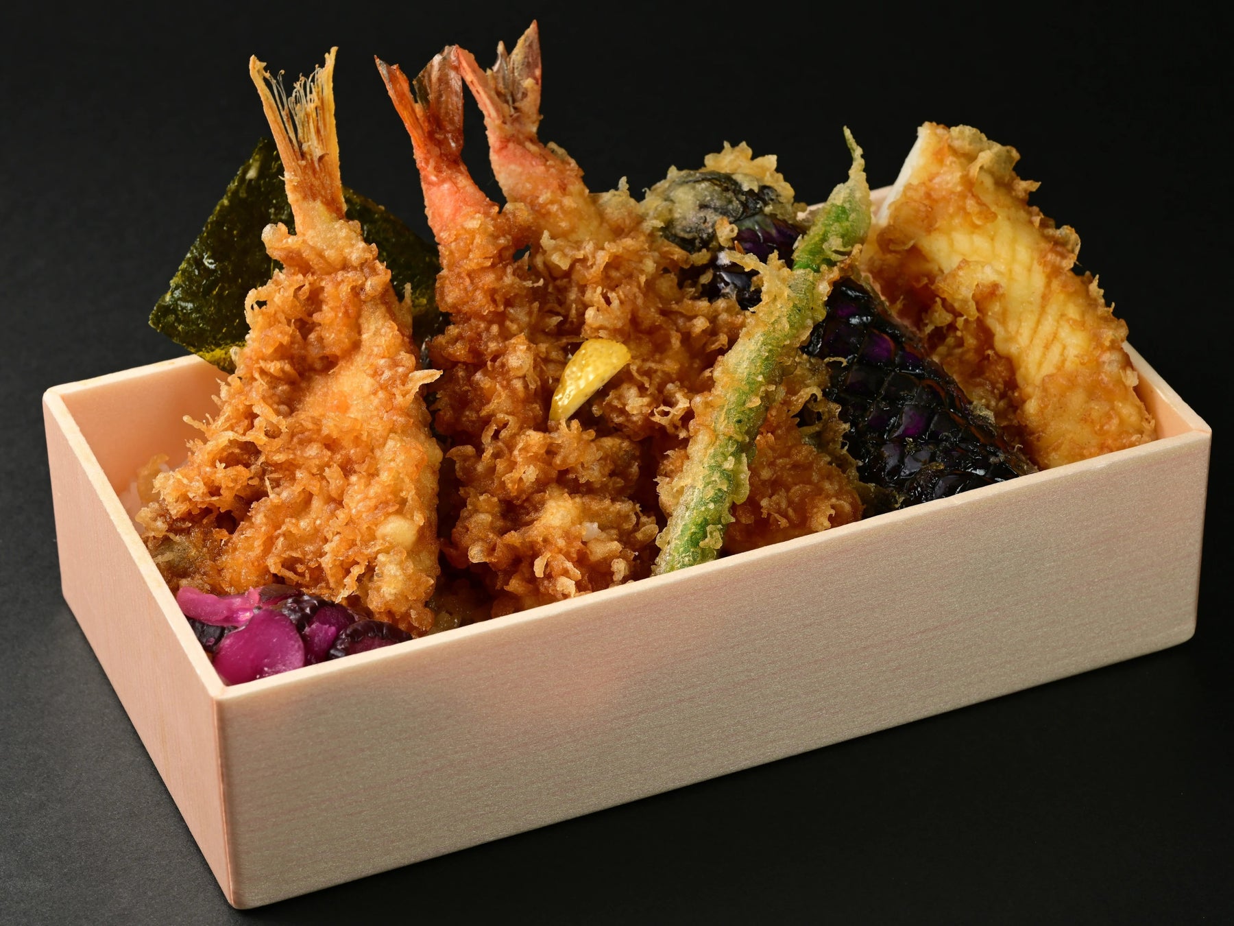 高温のごま油で揚げた粋で豪快な天ぷらと秘伝の丼たれ、ご飯の三位一体の絶妙なバランスを楽しめる天丼弁当。白身魚をメインに海老、烏賊、茄子、インゲン、海苔を詰め込んだ贅沢な上天丼です。