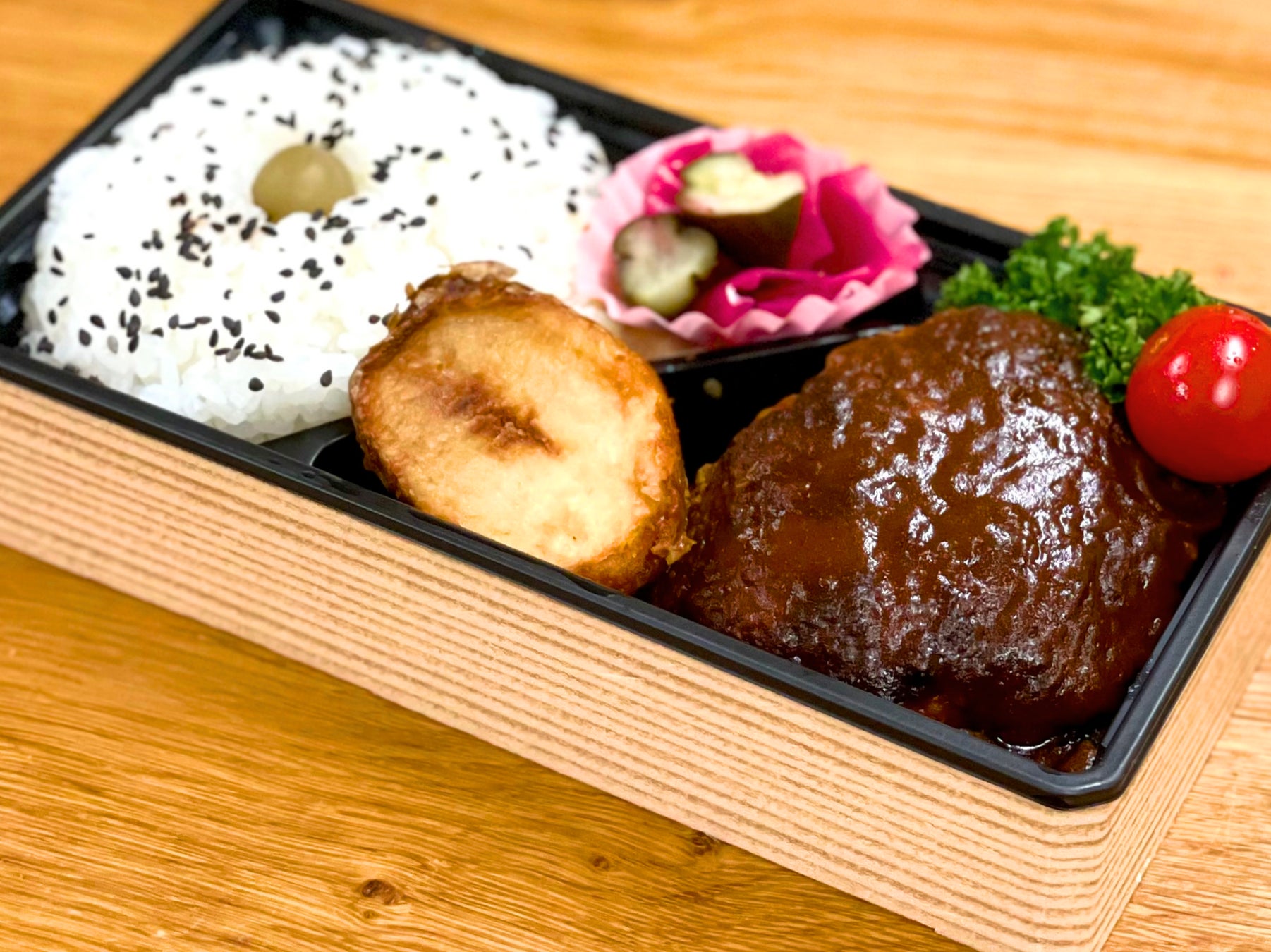自慢のデミグラスソースで仕上げたハンブルグステーキが入った、ボリューム満点のお弁当です。ハンブルグステーキは店内キッチンで挽き肉にするところから手作りし、一つひとつ焼き上げています。