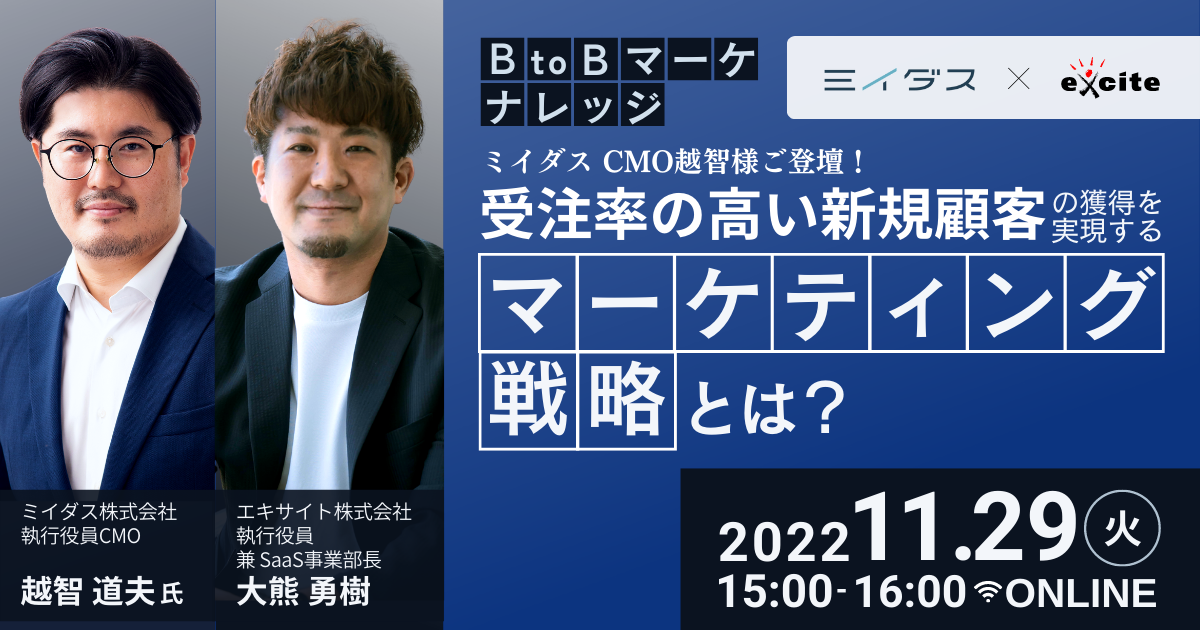 エキサイト株式会社(所在地:東京都港区、代表取締役社長:西條 晋一)は、パーソルグループのミイダス株式会社(所在地:東京都港区、代表取締役:後藤 喜悦)と共同で「受注率の高い新規顧客獲得を実現するマーケティング戦略」をテーマに11月29日(火)15:00〜より参加費無料のウェビナーを開催します。