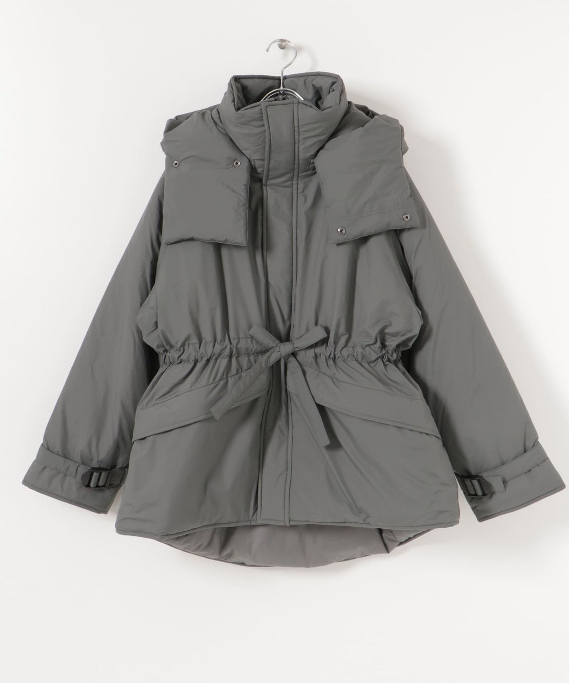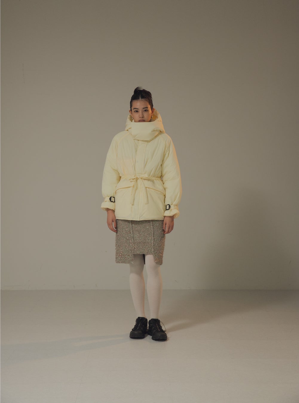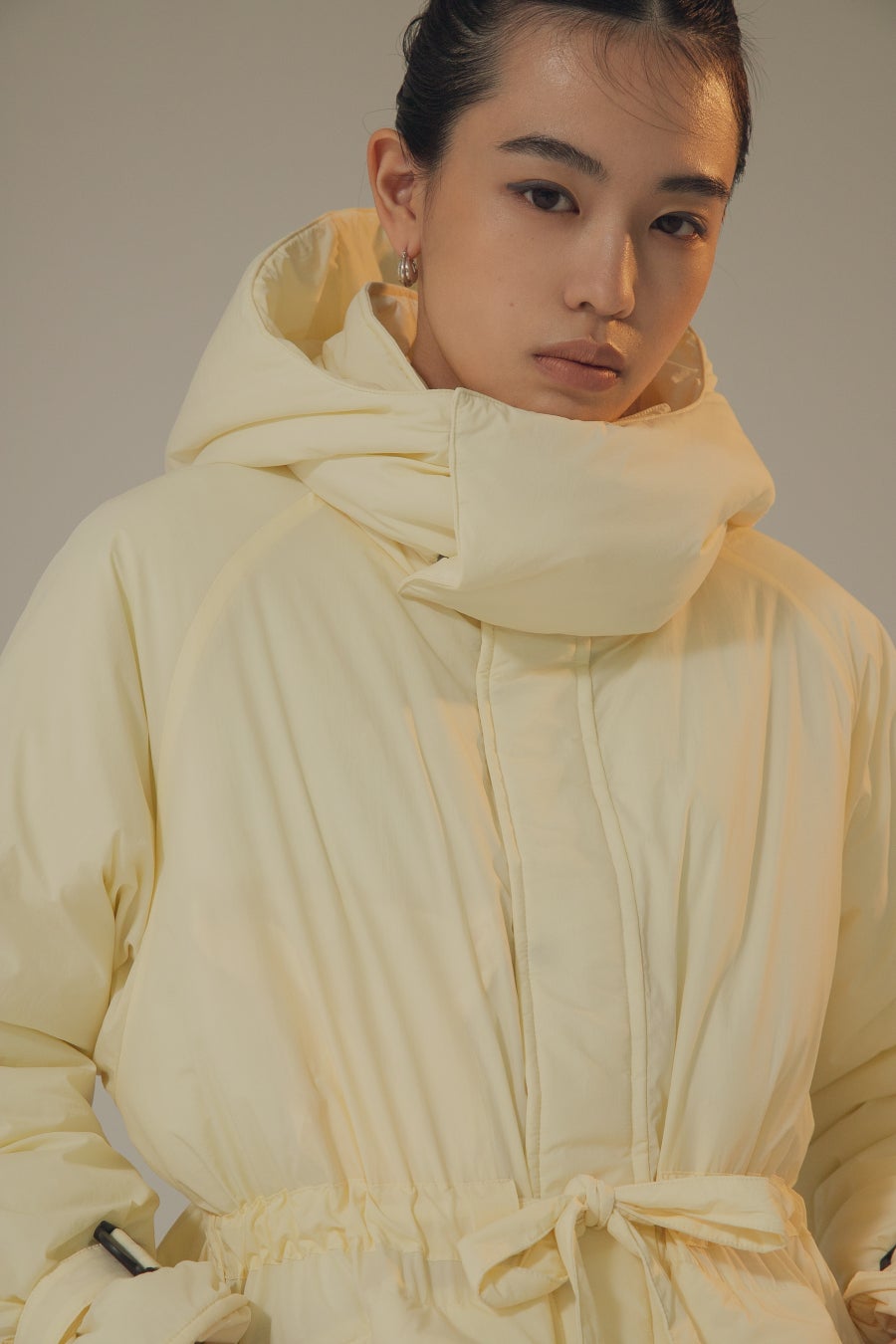 前後差のあるシルエットや、袖のベルトのデザインはそのまま継続し、今回は取り外しできるフードをつけ、少し立体感のある紐でギュッとウエストを絞って着ていただくことができます。