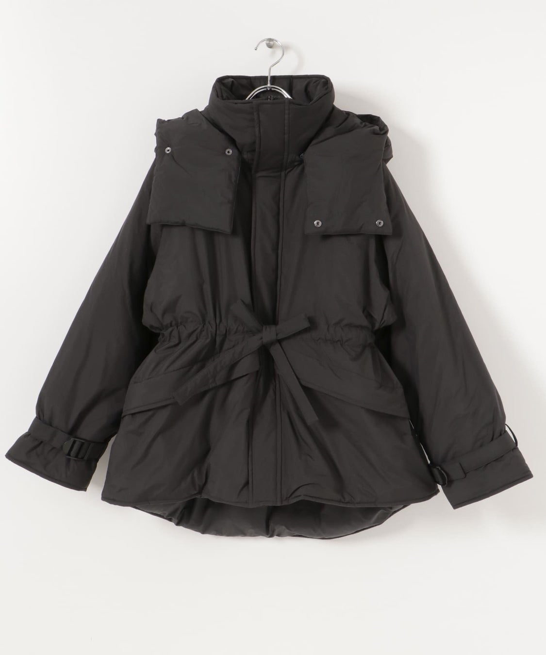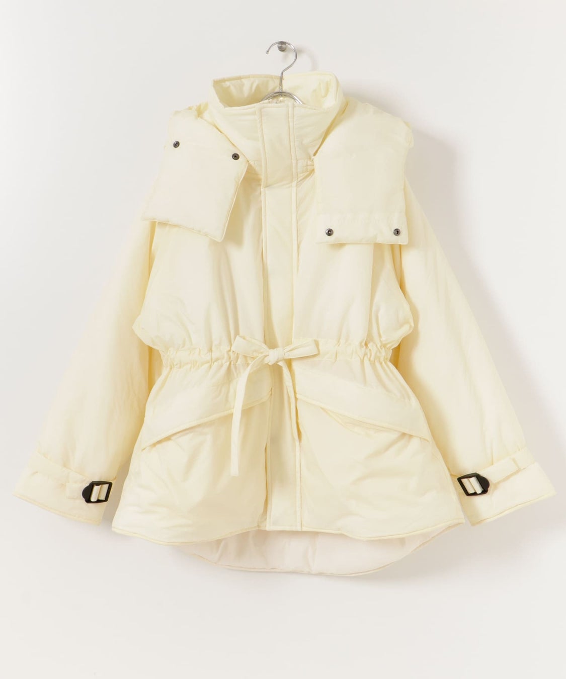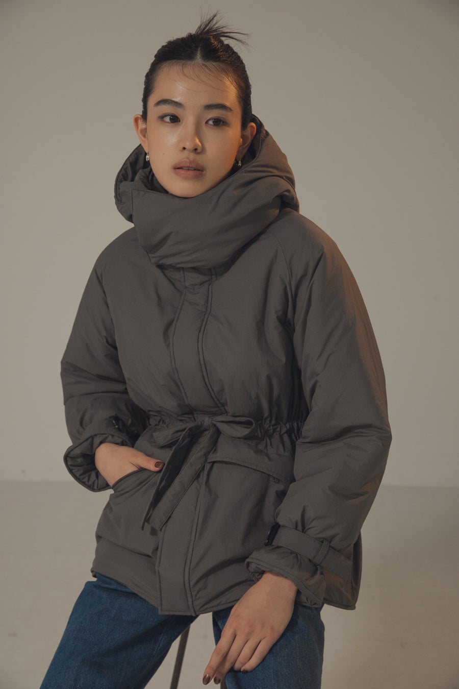 前後差のあるシルエットや、袖のベルトのデザインはそのまま継続し、今回は取り外しできるフードをつけ、少し立体感のある紐でギュッとウエストを絞って着ていただくことができます。