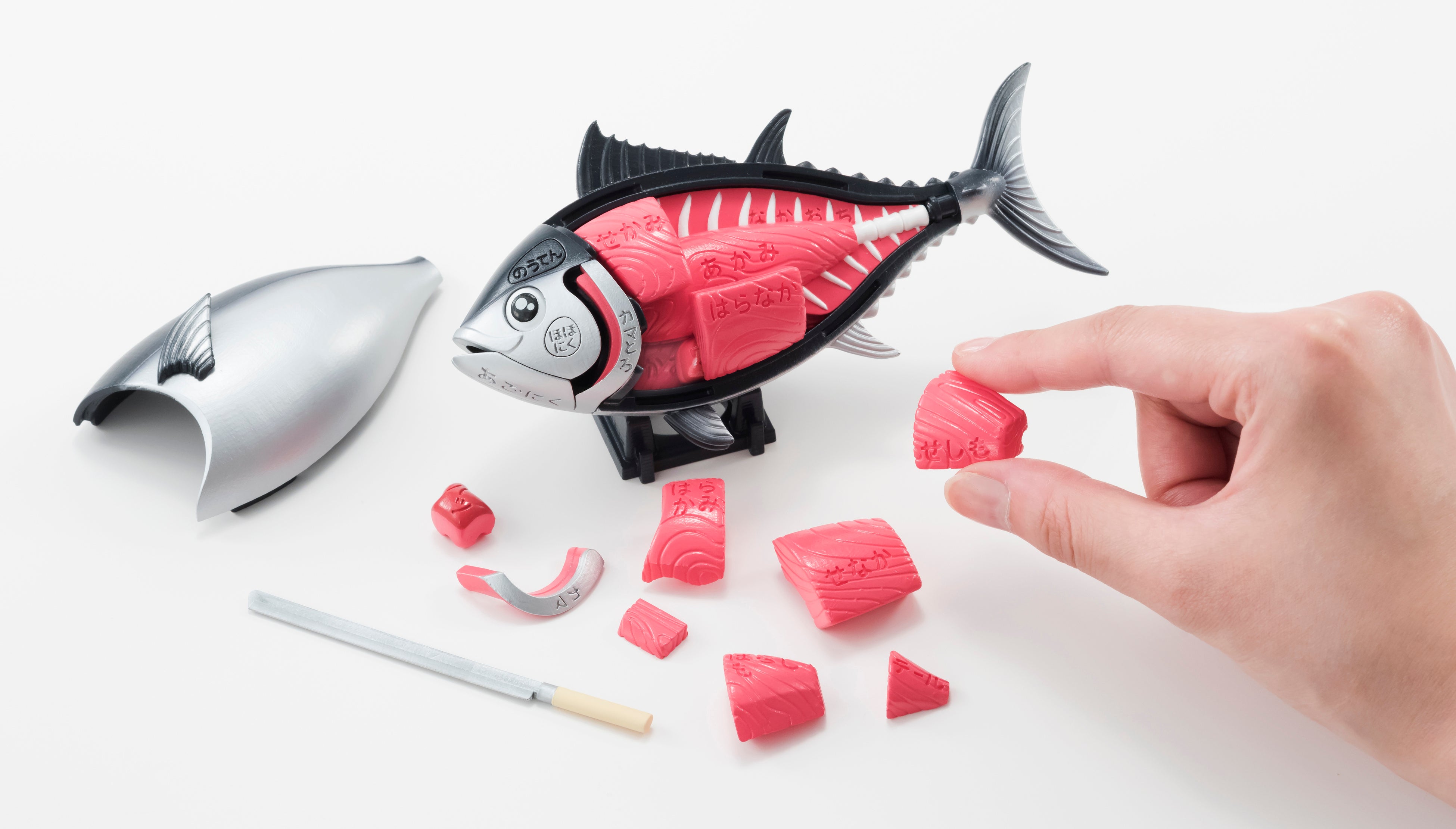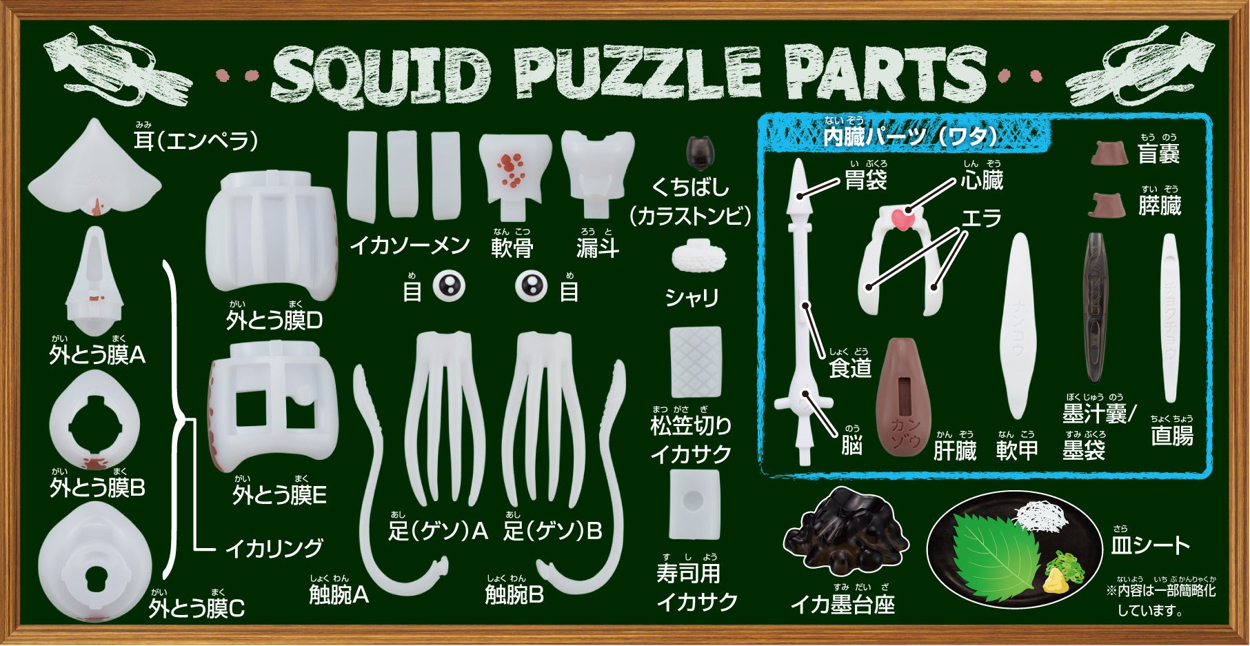 新商品『一杯買い!!イカ解体パズル』は、イカの部位のパーツを正しい位置に組み合わせ、完成させて楽しむ全長約15㎝の立体パズルです。イカの部位はエンベラ(耳)、ゲソ(足)、くちばし、エラ、の他、カットされたイカソーメンなど全28パーツもあります。部位パーツの多さだけでなく、ゲソと触腕のパーツはリアルにやわらかい素材で出来ているのも特徴の1つです。パズルを完成させる他にイカを捌く・エンペラを剥がす・イカの寿司を作る・ワタを抜き取る、などの遊びもできます。各パーツには部位の名称が書いてあるので、遊びながらイカのからだの仕組みが学べます。