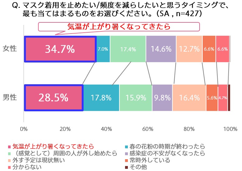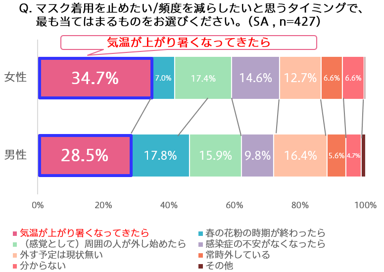 マスクを常時外している方は約6%とまだ少ないものの、今後外したいタイミングでは「暑くなってきたら」がNO.1の結果に。今後暑さが本格化する中、ますます外す人は多くなりそうですね。