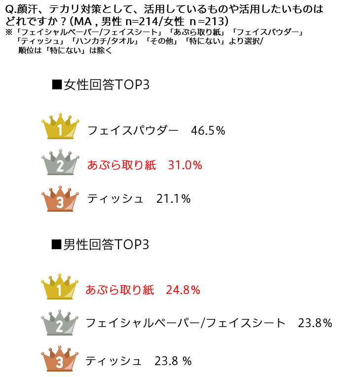 肌トラブルやメイク崩れの原因にもなり、今後気温の上昇と共に気になる“顔汗や、皮脂によるテカリ”対策に活用している又は活用したいものは、男性では“あぶら取り紙”、女性では”フェイスパウダー”が1位となりました。