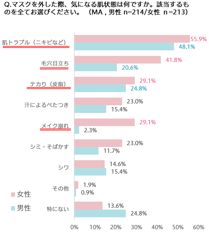 マスクを外した際に気になる肌状態は、男女共通して「肌トラブル(ニキビなど) 」がダントツの1位!男性では「テカり」「毛穴目立ち」と続き、女性は「毛穴目立ち」「テカり」&「メイク崩れ」となっています。