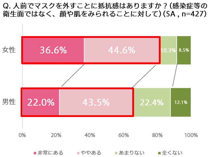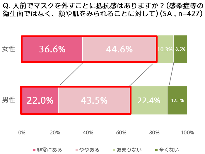 そうした意向がある一方、マスクを人前で外すことに対して、女性は8割、男性も6割以上が「抵抗感がある」と回答しており、マスクで隠れていた部分が見られることに少なからず抵抗感を持っているようです。