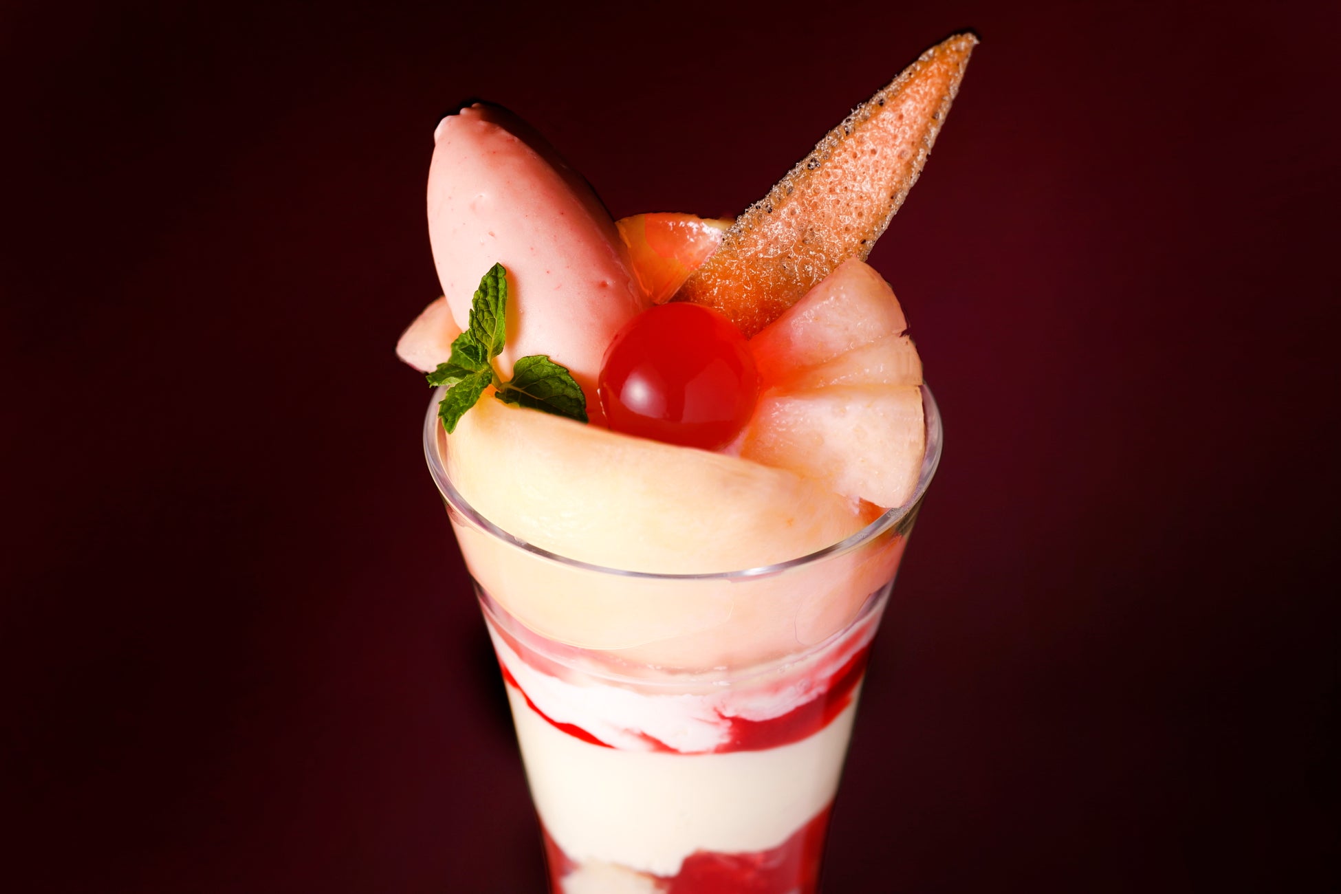 和歌山県のブランド桃“あら川の桃”を使用したパフェです。 樹上でギリギリまで完熟させてから収穫した“あら川の桃”は、ふわりと香る果肉が柔らかく、豊潤な果汁がお口いっぱいに広がります。