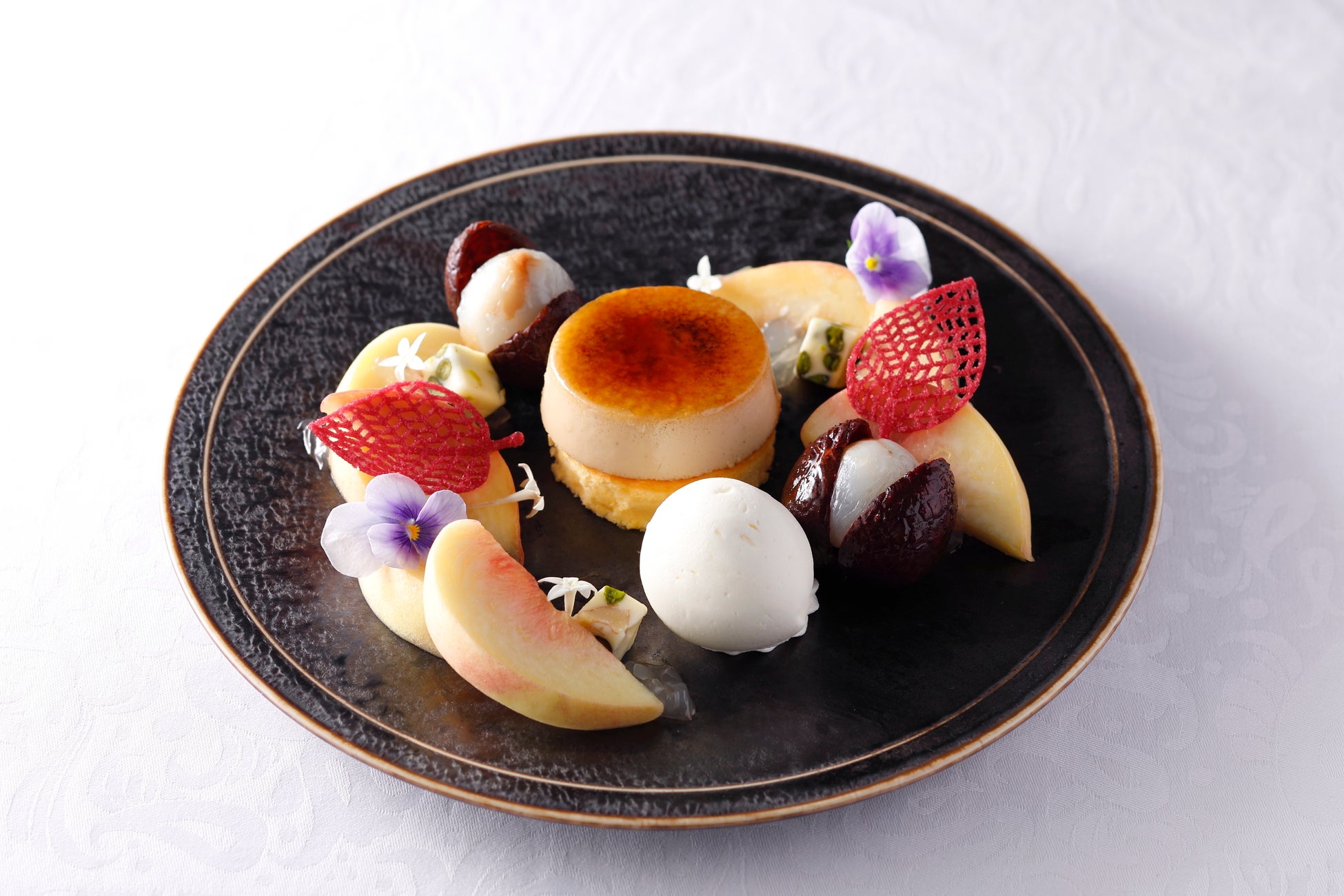 “あら川の桃”をコンポートとフレッシュの2種でふんだんに使用しました。白ワイン風味のサヴァランとミルクアーモンドアイスクリームとのハーモニーをお楽しみください。