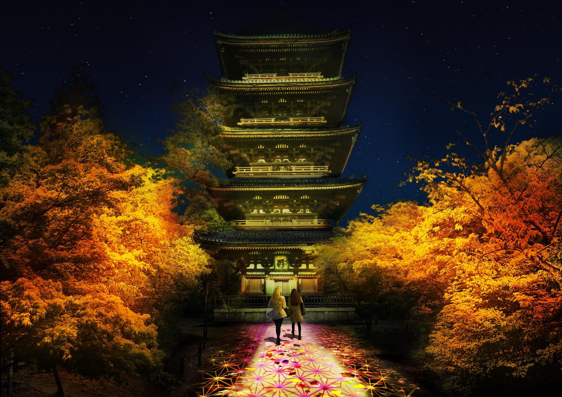 重要文化財である五重塔を背景に、プロジェクションマッピングで、着物をモチーフに伝統的な紋様や絵柄を展開。