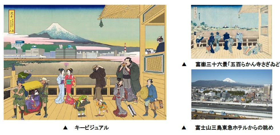 本機能のキービジュアルは浮世絵イラストレーターのNAGA氏によるもので、葛飾北斎の代表作にして、浮世絵風景画の代表作でもある富嶽三十六景「五百らかん寺さざゐどう(ごひゃくらかんじさざいどう)」に独自の解釈を加え、本サービスの人気施設の富士山三島東急ホテルからの風景画としてデザインしています。時代や場所、カルチャーを入り混ぜた現代版浮世絵として、利用者にとって身近で親しみを感じるAIコンシェルジュを目指します。<本機能のキービジュアルについて>