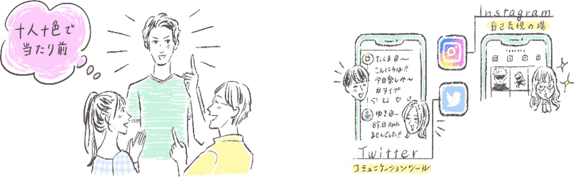 “推し活”の内容は人によって異なるため、その人がどんな人物か理解し仲良くなるきっかけになっています。自分が“推し”の良さを伝えることで相手が理解してくれるのは嬉しい一方で、好きなものが人それぞれであることは当たり前だし違うからこそ面白い、多様性を大切にする現代の若者らしさも見受けられます。情報収集で活用しているSNSも、コミュニケーションをしたいのか、自己表現がしたいのかによって用途別に使い分けをしています。