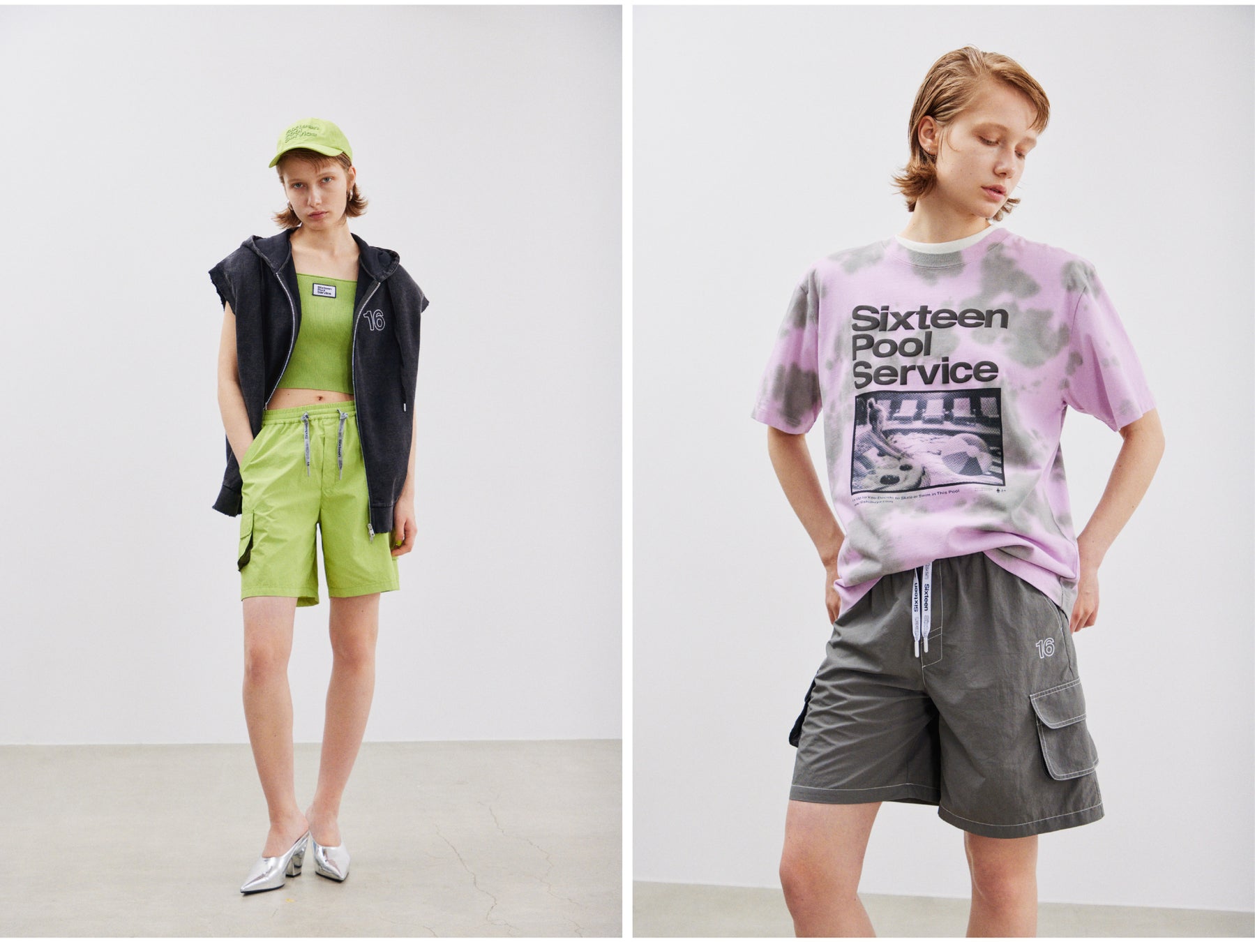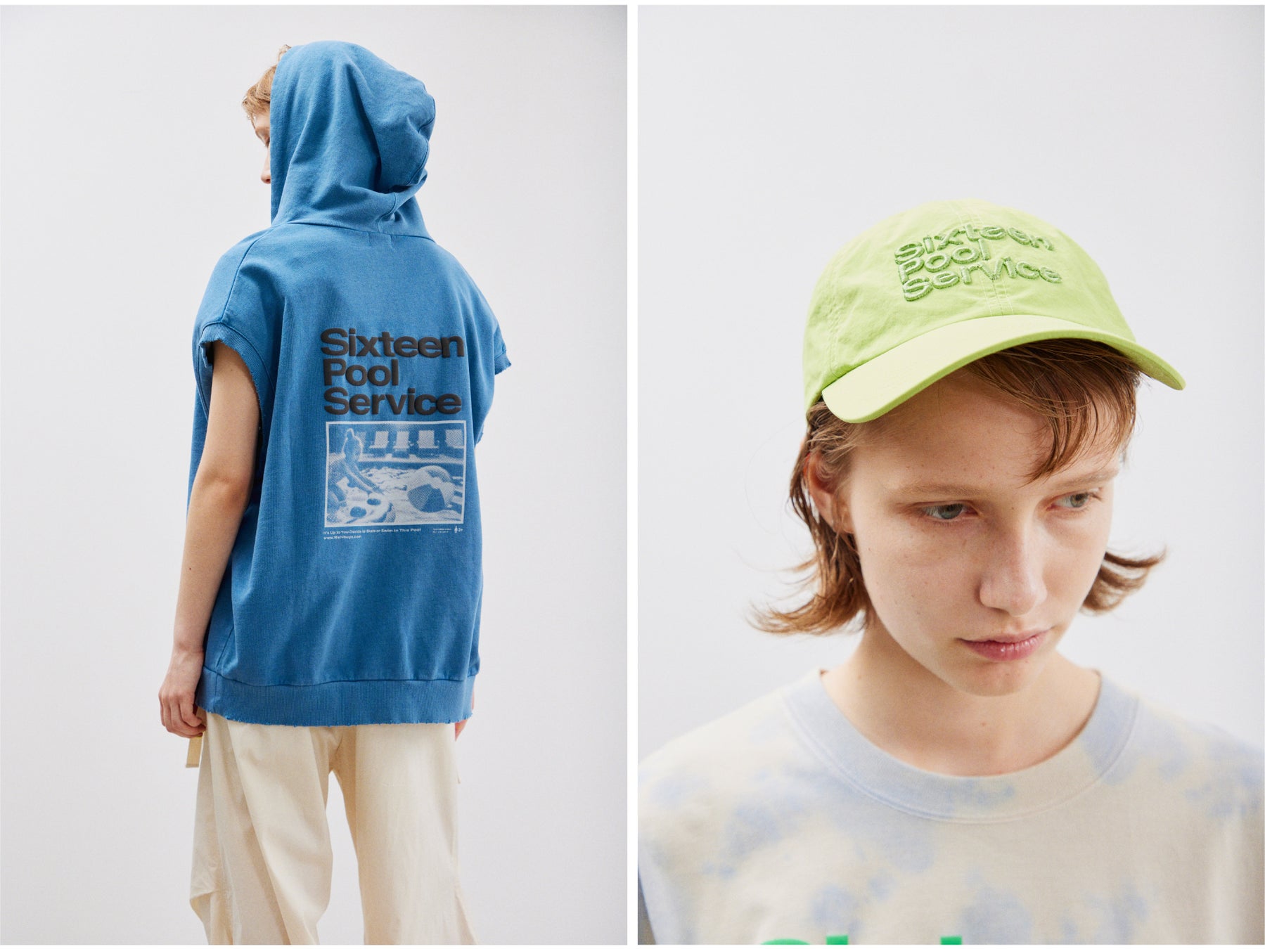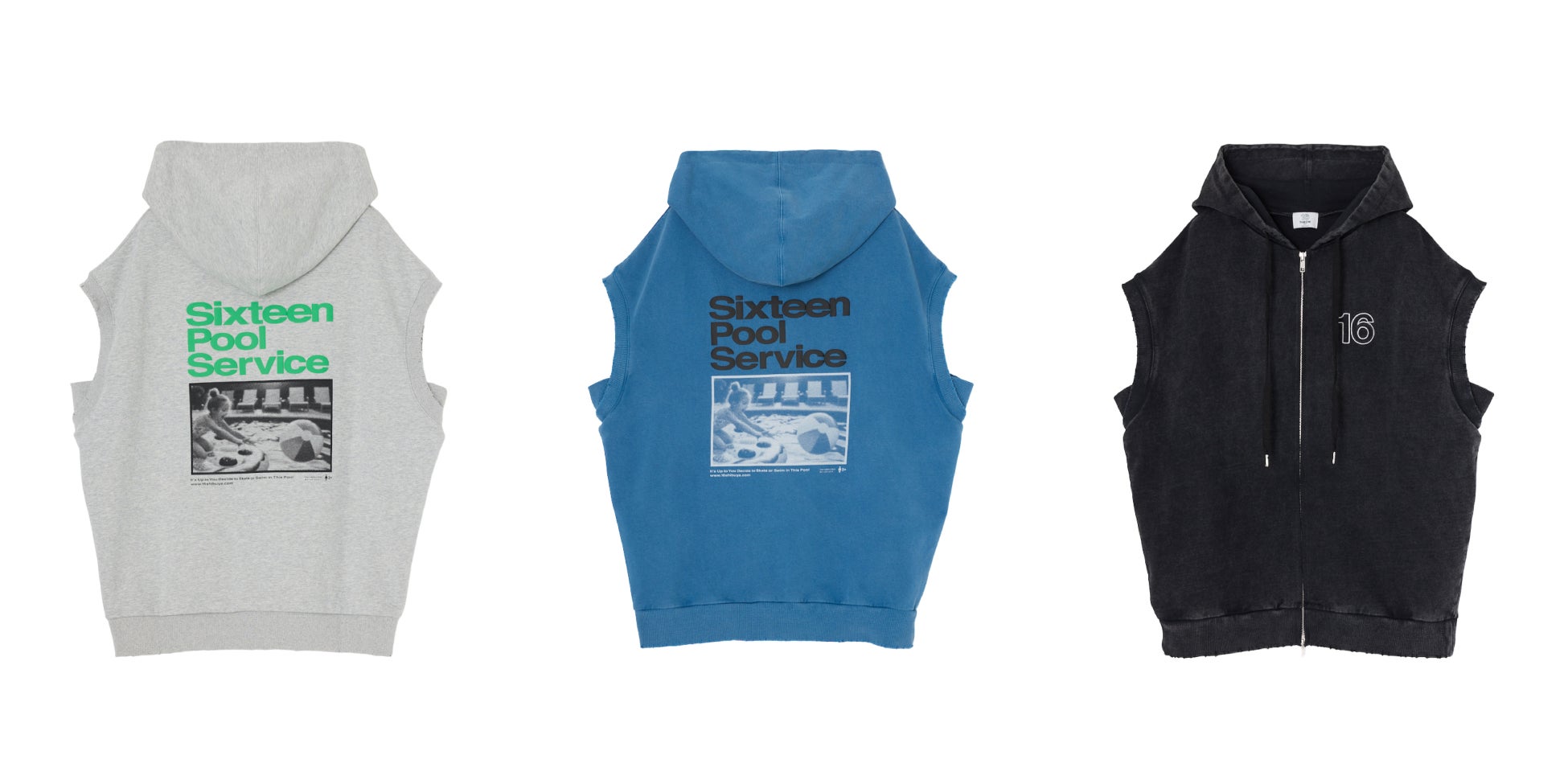 16(Sixteen)から年に1度のみリリースされている『Sixteen Pool Service』のロゴやフォトプリントを、夏らしいアイテムに落とし込んだコレクションに。水を抜いたプールでスケートボードを楽しむカルチャーもありますが、あえて水の入ったプールで楽しむ様子がプリントされたユニセックスで着用可能なTシャツやノースリーブパーカー、オリジナルのロゴワッペンをフロントにあしらったニットキャミソールの他、弱撥水を施したナイロン素材を使用したショートパンツ、キャップの全5型が揃います。
