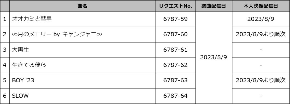 併せて、新曲「オオカミと彗星」「∞月のメモリー」「BOY ‘23」の本人映像を8月9日より順次配信します。