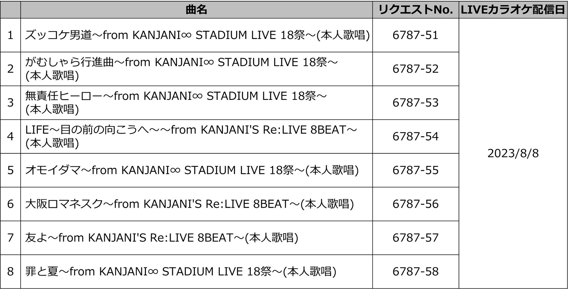 通信カラオケDAMでは、2021年11月に横浜アリーナで開催した『KANJANI‘S Re:LIVE 8BEAT』と2022年7月に横浜・日産スタジアムで開催した『KANJANI∞ STADIUM LIVE 18祭』の2公演からカラオケでも人気曲の8曲を、LIVEカラオケ*として独占配信します。
